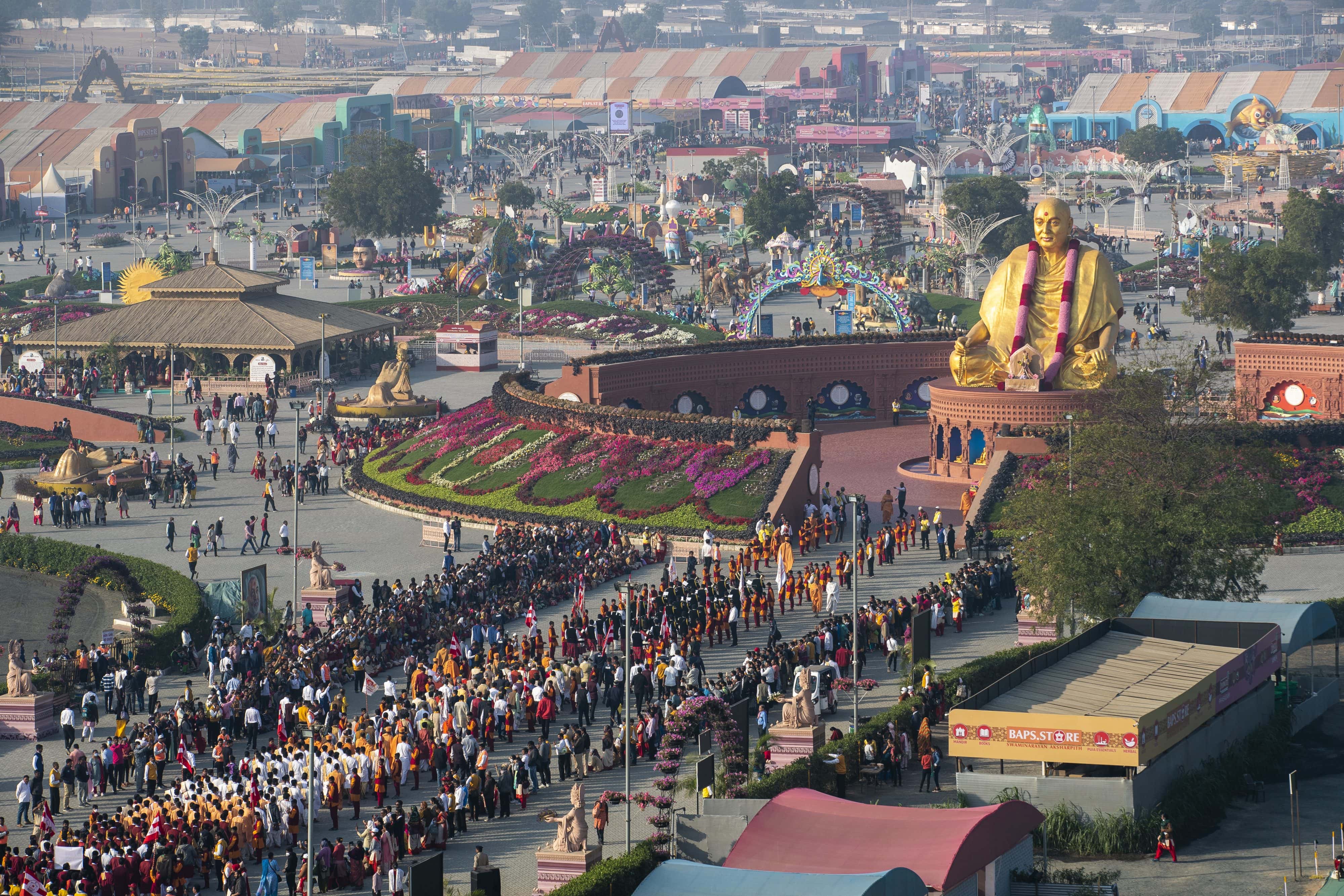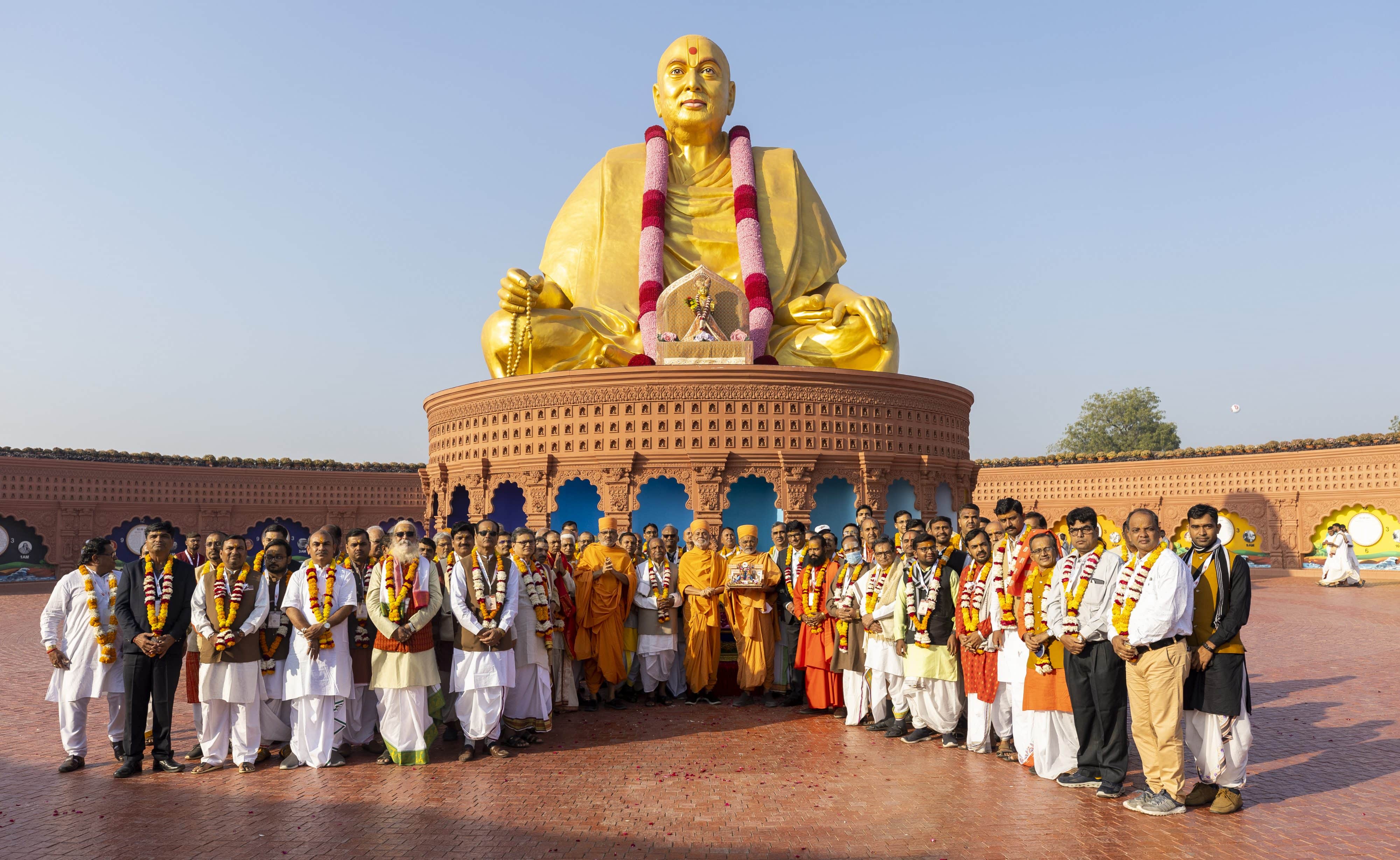 Prior to the start of the conference, scholars from more than 20 Sanskrit Universities were welcomed with a musical band. Led by learned swamis of the BAPS Swaminarayan Sanstha, Dr. Viveksagardas Swami, Mahamahopadhyay Bhadreshdas Swami, and Dr. Shrutiprakashdas Swami, the procession walked from the ceremonial gate of the Pramukh Swami Nagar to the Pramukh Swami Maharaj Vandana Sthal. Accompanied by the chanting of Vedic mantras for world peace and for the auspicious inauguration of the conference, the scholars paid tribute to the 30-foot murti of Pramukh Swami Maharaj.