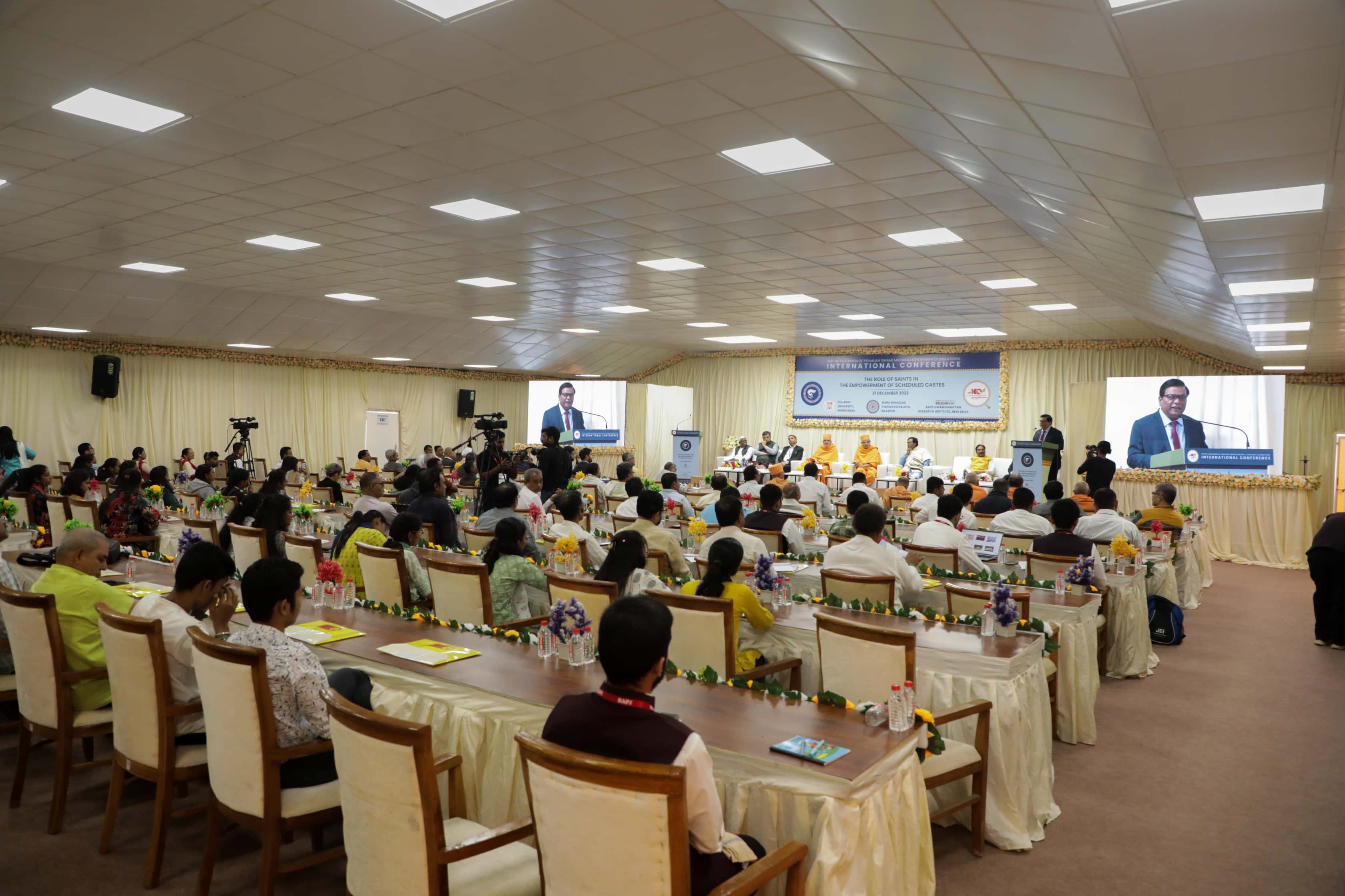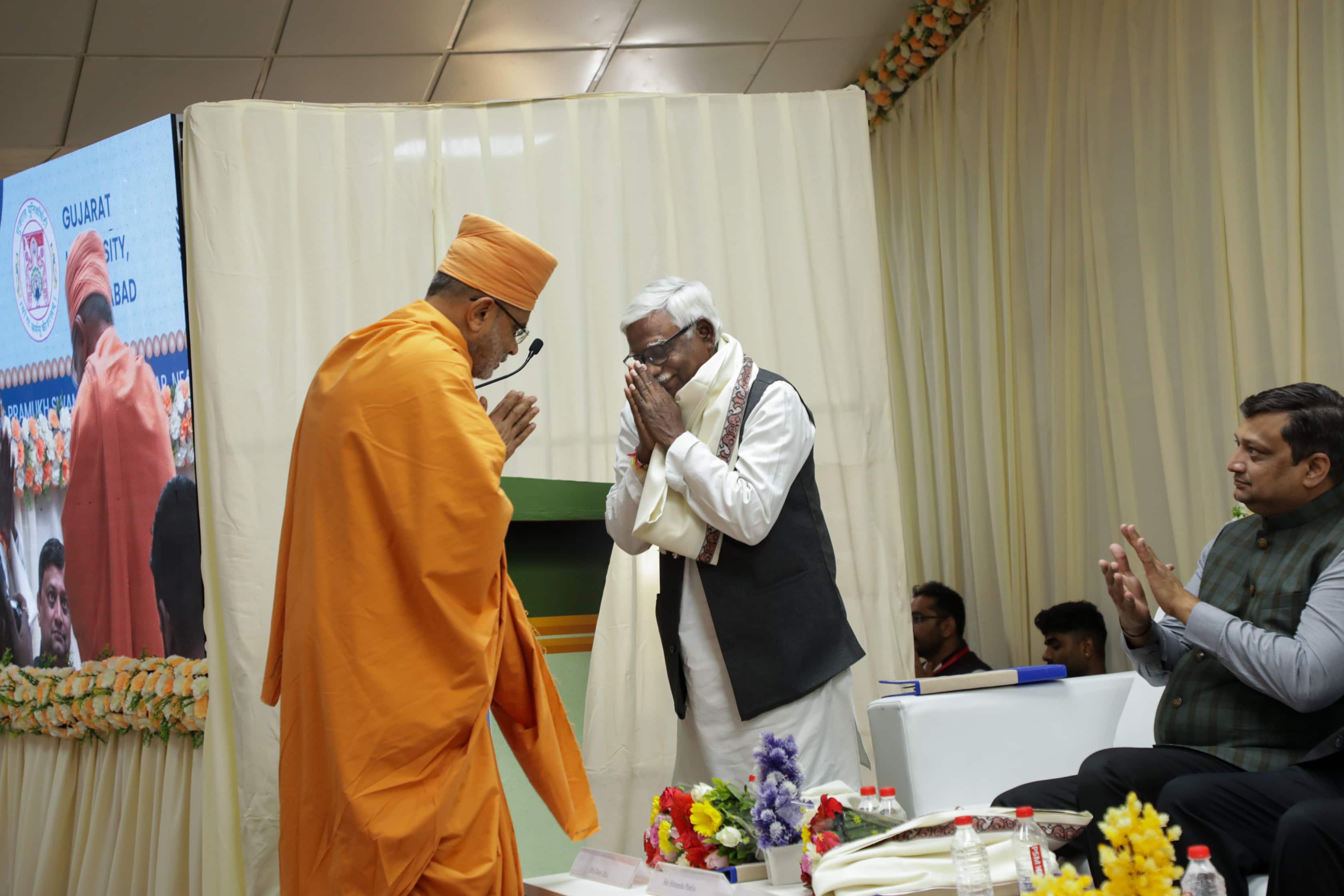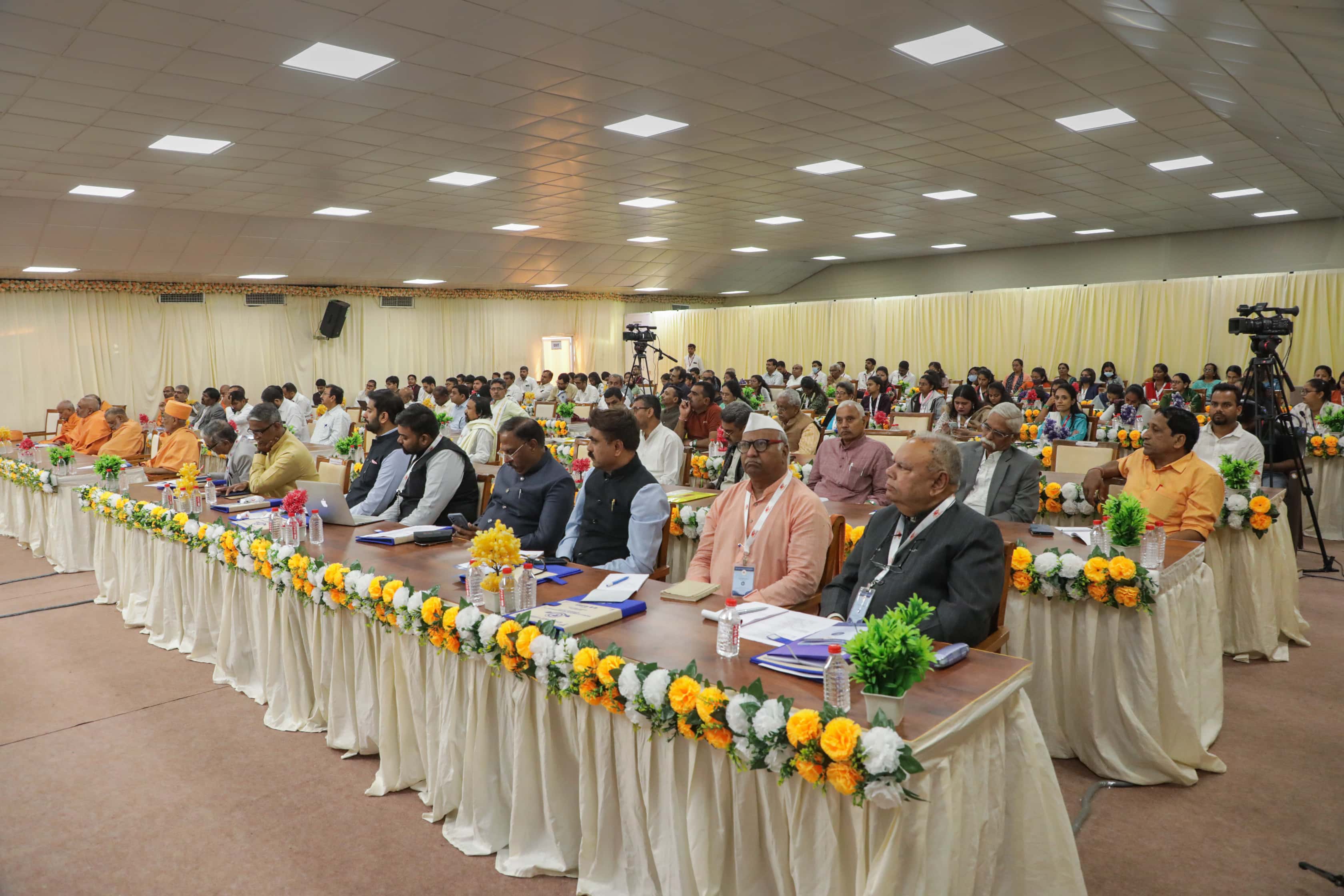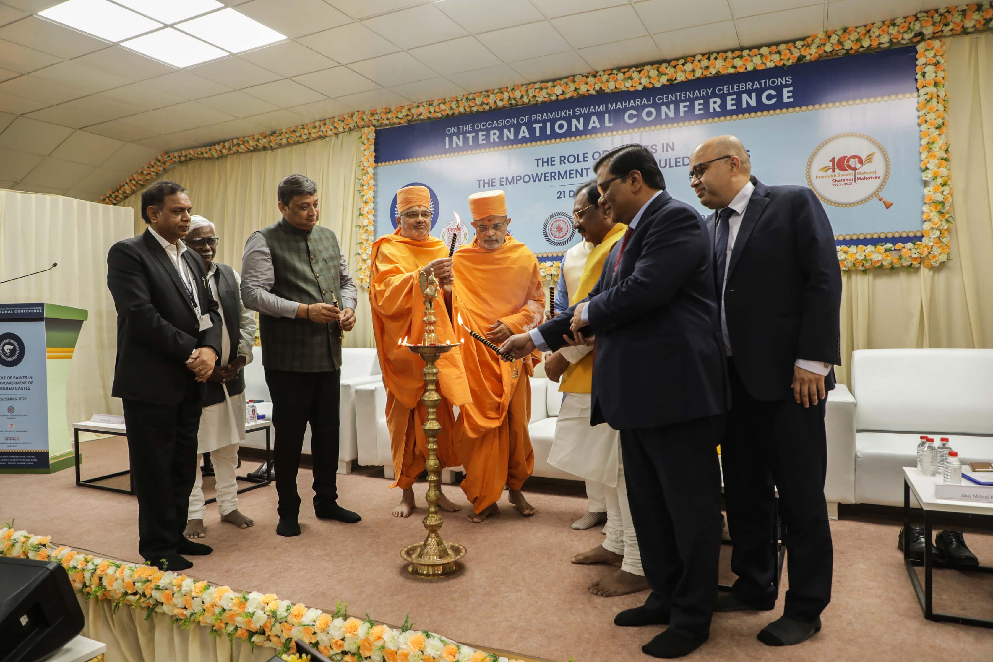 The conference was inaugurated by Pujya Gnaneshwardas Swami. He performed the deep pragatya in the presence of Mahamahopadhyay Bhadreshdas Swami, Aksharvatsaldas Swami, and others. Padma Shri Milind Kamble, the founding member of the Dalit Indian Chamber of Commerce and Industry; Prof. Alok Kumar Chakrawal, Vice Chancellor of Guru Ghasidas Vishwavidyalaya, Bilaspur; Prof. Himanshu Pandya, Vice Chancellor of Gujarat University; Shri Sanjiv Dangi, a member of the Board of Directors, IIM, Ahmedabad; Dr. Bizay Sonkar Shastri, a former Member of Parliament; Shri Ramanlal Vora, a former Education Minister of Gujarat; and Shri Devji Rawat, the National Secretary of the Vishva Hindu Parishad, were among the dignitaries who graced the inaugural ceremony.
