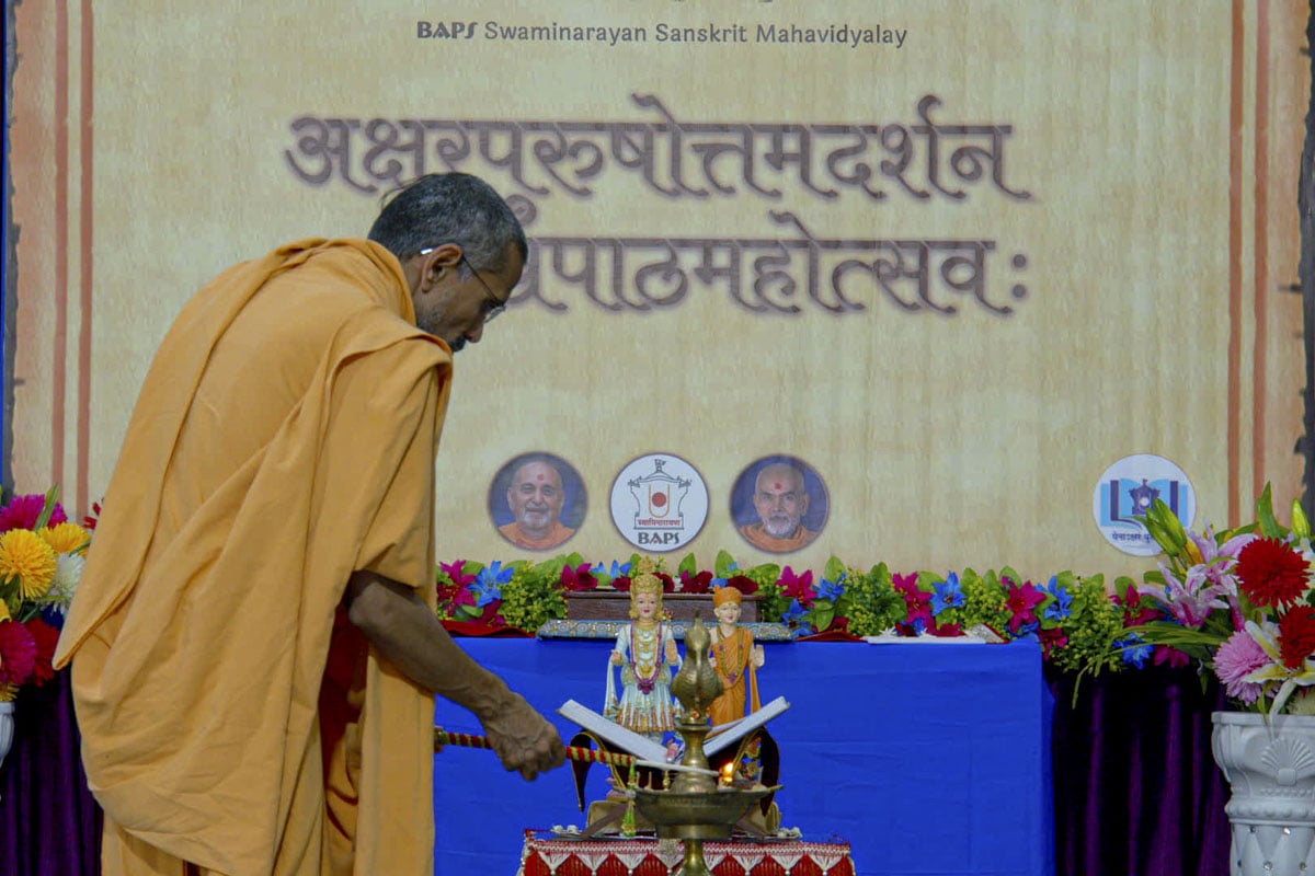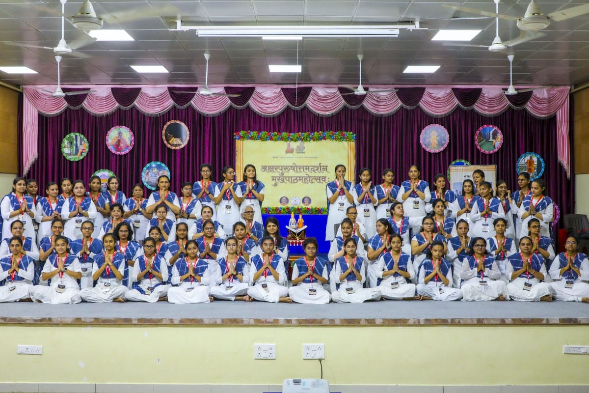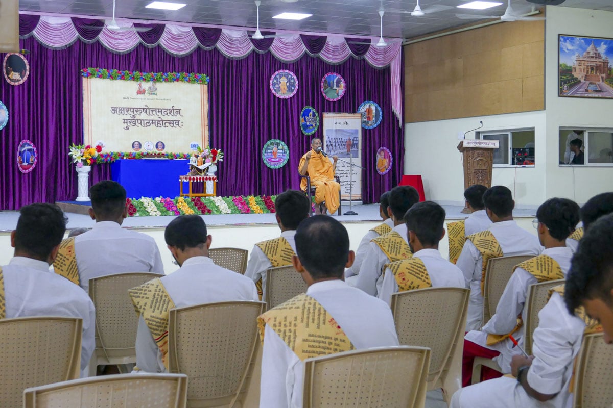 As part of Pramukh Swami Maharaj’s Centenary Celebrations, BAPS Swaminarayan Sanskrit Mahavidyalaya, Sarangpur, organized an Akshar-Purushottam Siddhant Karika Mukhpath Mahotsav. Around 100 students studying in various courses at BAPS Swaminarayan Sanskrit Mahavidyalaya, as well as those affiliated to the Mahavidyalaya through online courses or external studies through Shree Somnath Sanskrit University, enthusiastically participated.