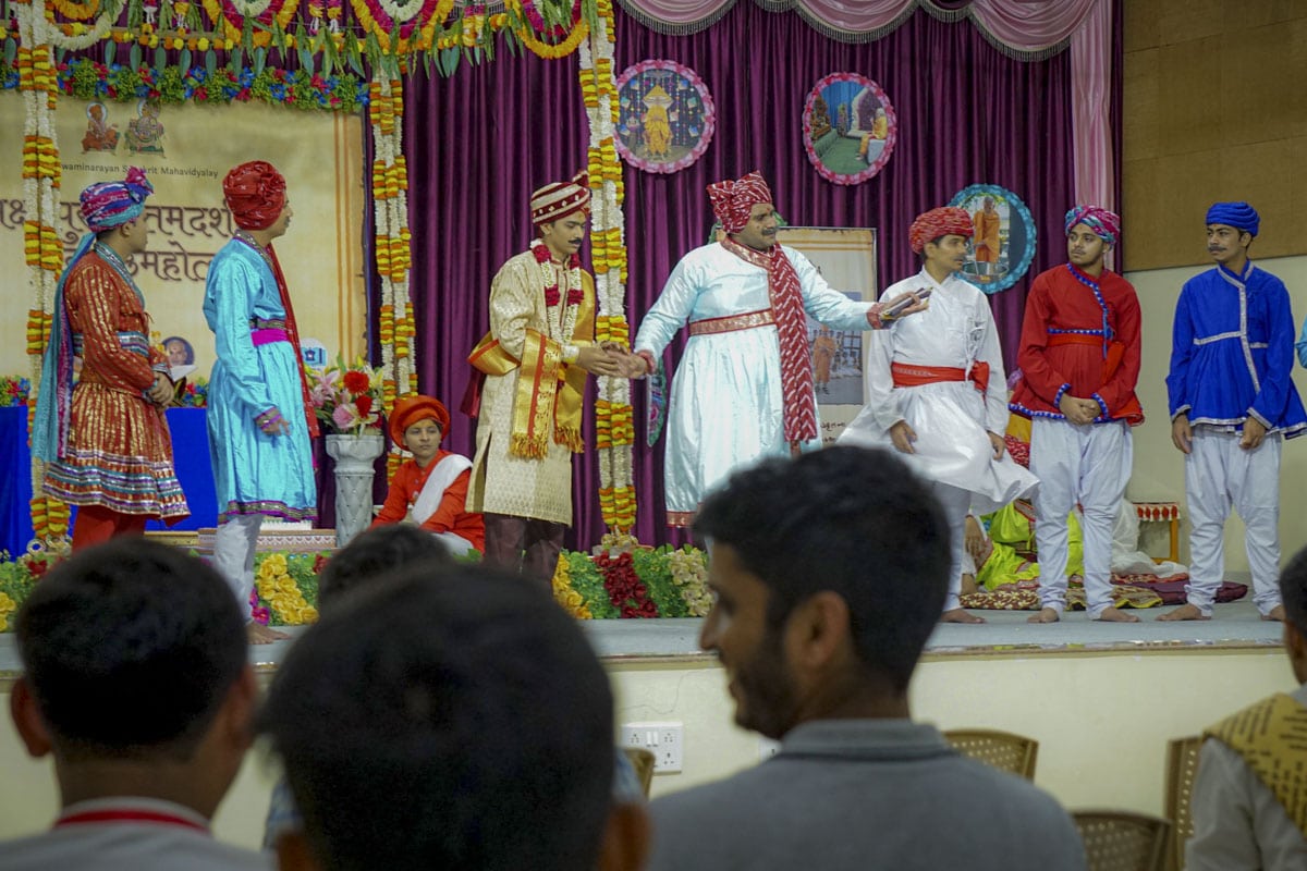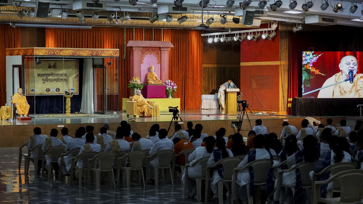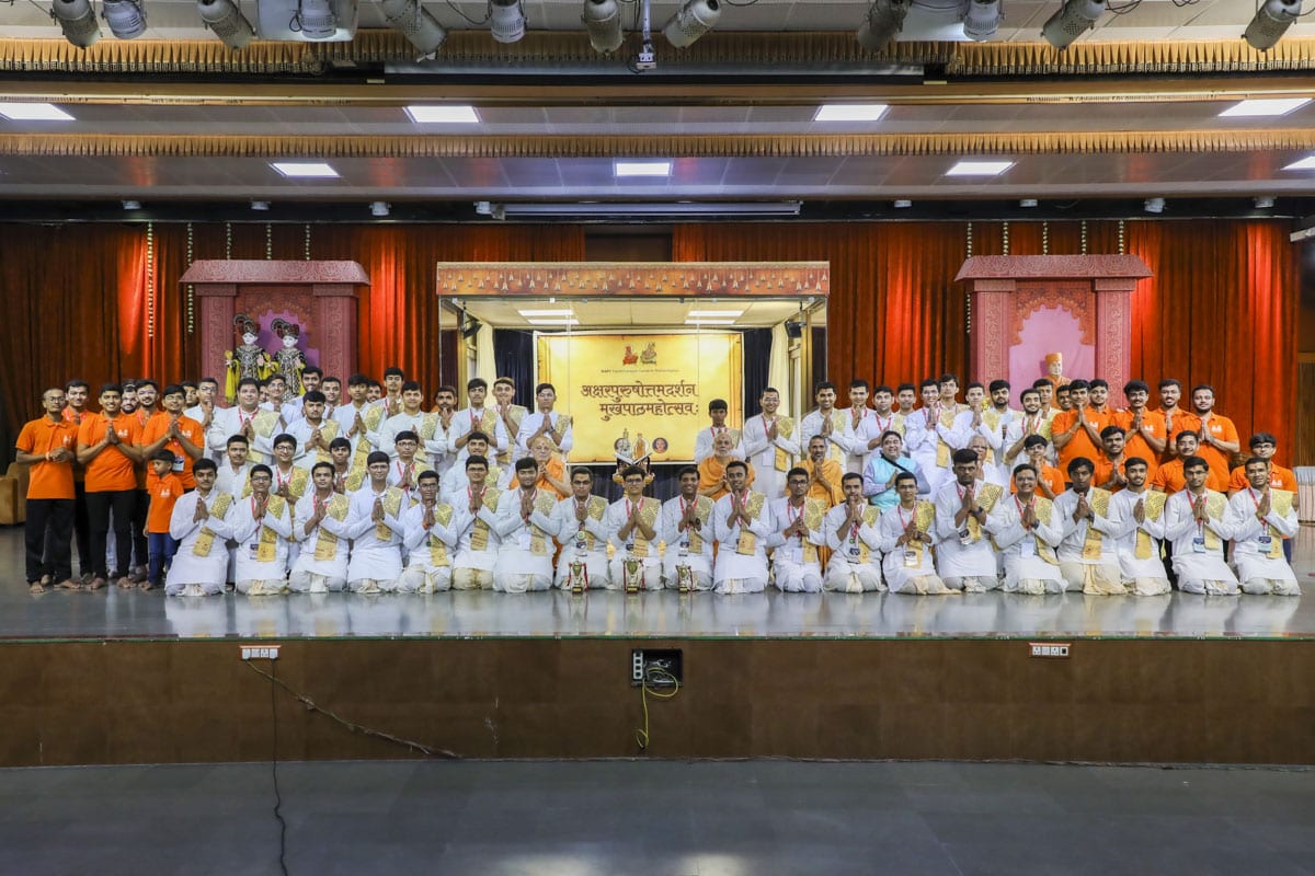 In the afternoon, a special assembly was also held at BAPS Mandir, Ahmedabad, in the presence of Ishwarcharandas Swami, Vivekasagardas Swami and Atmaswarupdas Swami, in which students presented their mukhpath and received their awards.