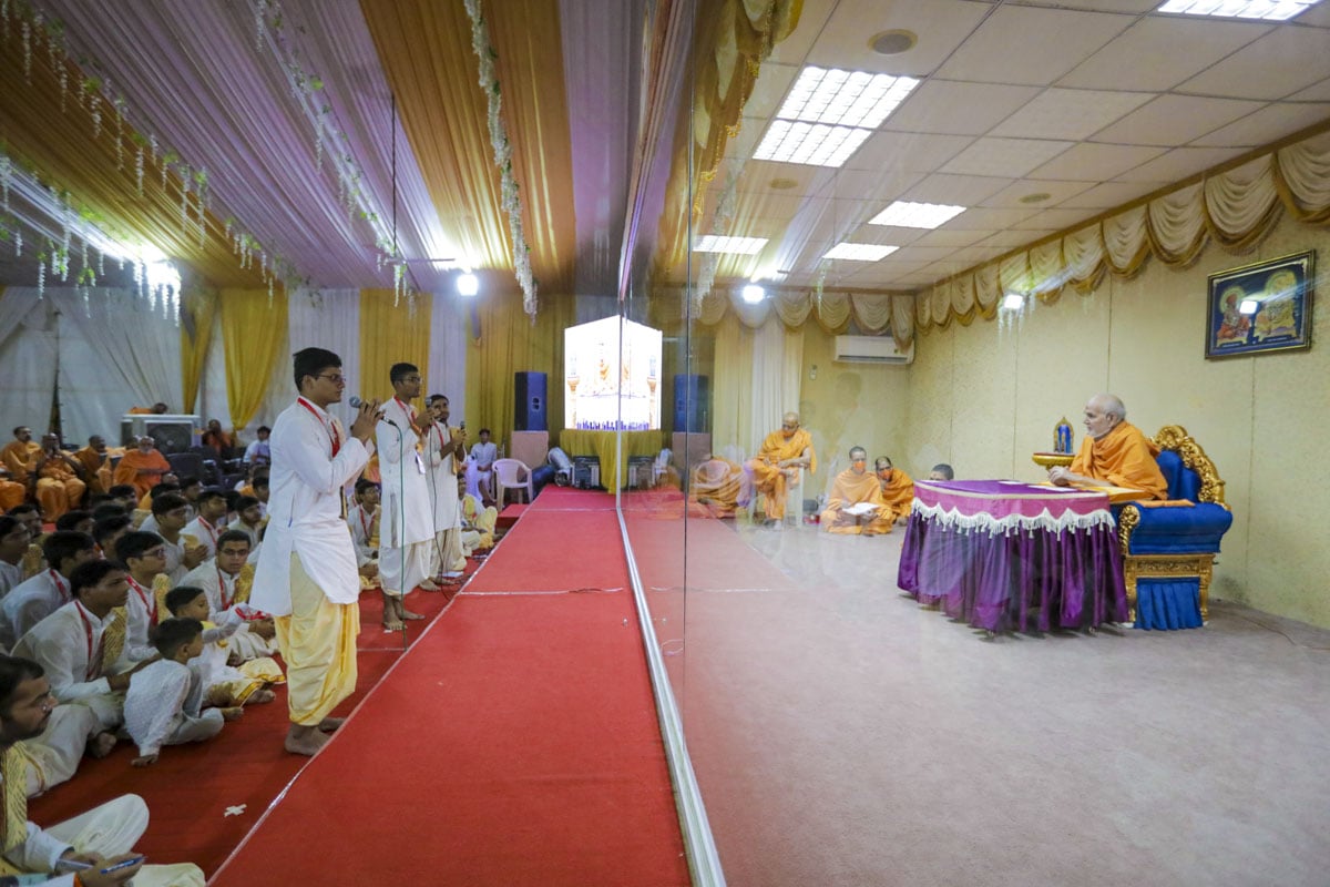 On the morning of 6 August, students recited selected Sanskrit karikas and their Gujarati translations during Swamishri’s puja.