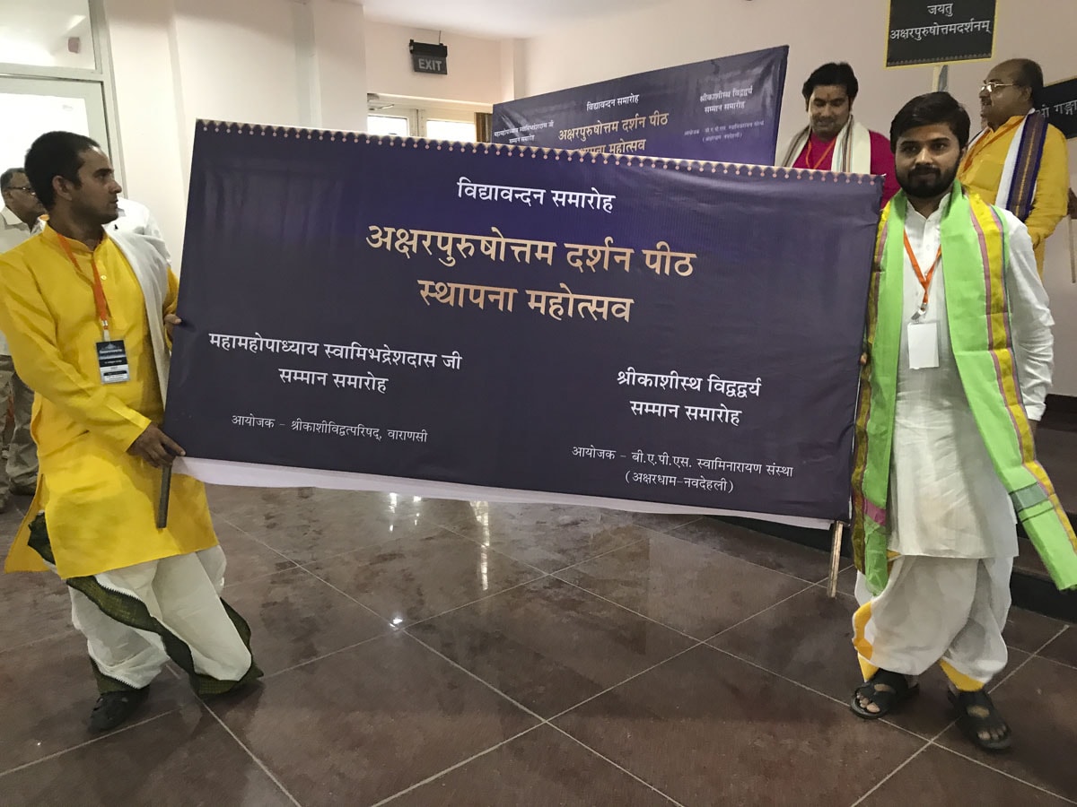 To celebrate the official declaration of the founding of the Akshar-Purushottam Darshan Pith by the BAPS, and to felicitate Bhadreshdas Swami for his landmark texts, the Kashi Vidvat Parishad organized a special assembly in the esteemed presence of Pujya Kothari Swami (Bhaktipriyadas Swami) and over 125 distinguished scholars at the Kashi Hindu Vishwavidyalaya on 28 June 2019.