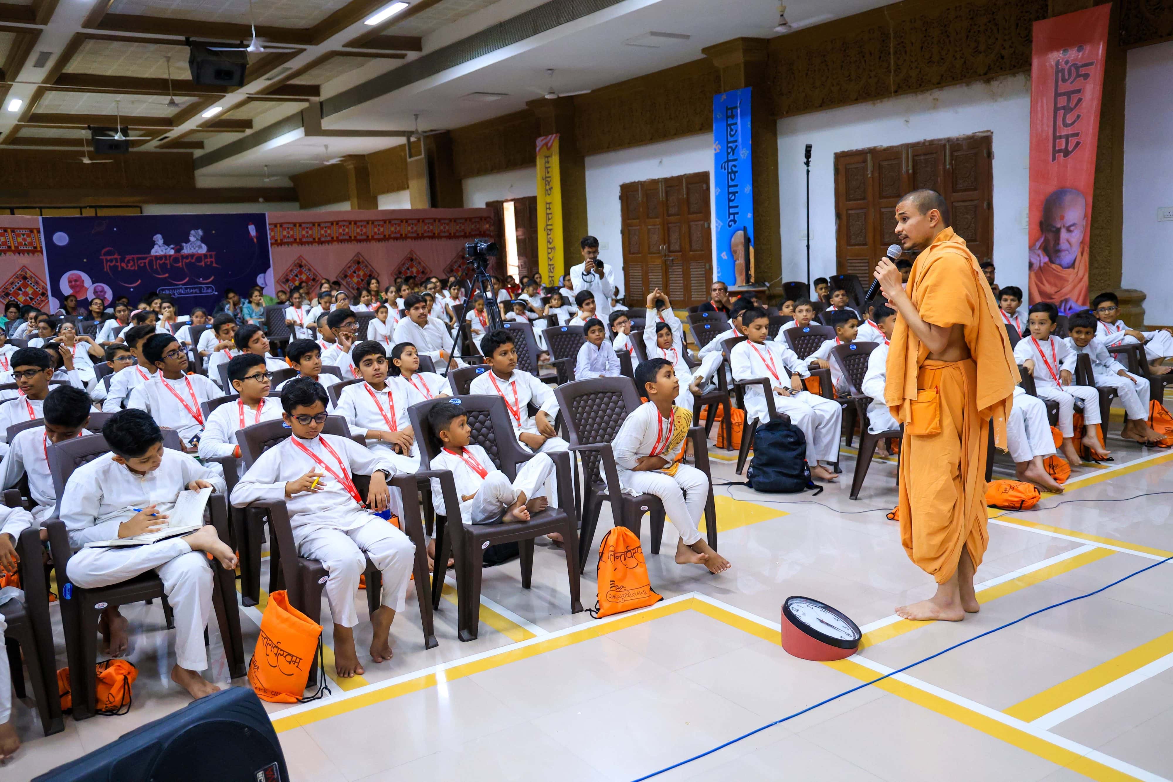 From across India, 43 balaks and 39 balikas, who had memorized the Swaminarayan Siddhant Karika (565 shloks) and Satsang Diksha (315 shloks) attended this shibir. Newly enrolled balaks and balikas also attended. During the last year, through the Siddhant Sarvasvam curriculum, the students have studied Pramukh Sanskritam (basics of the Sanskrit language), Swaminarayan philosophy, brief biographies of the gunatit guru parampara and other sampradayik texts. During this shibir, the children received special training in public speaking, storytelling, Sanskrit communication and other skills. The students also participated in various classes and creative activities, played sports and watched a magic show.