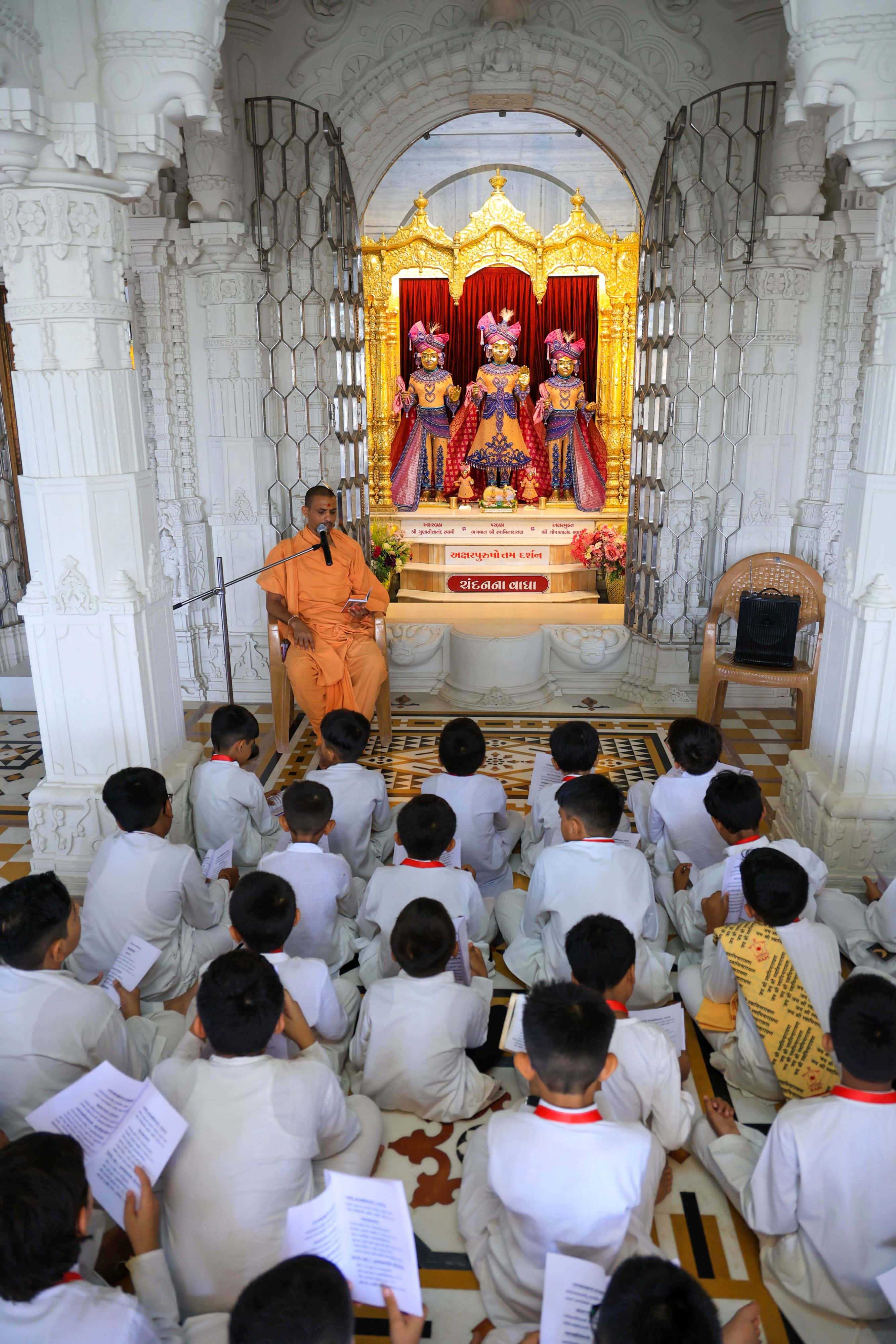 Mahamahopadhyaya Bhadreshdas Swami with balaks at Shastriji Maharaj Smruti Mandir