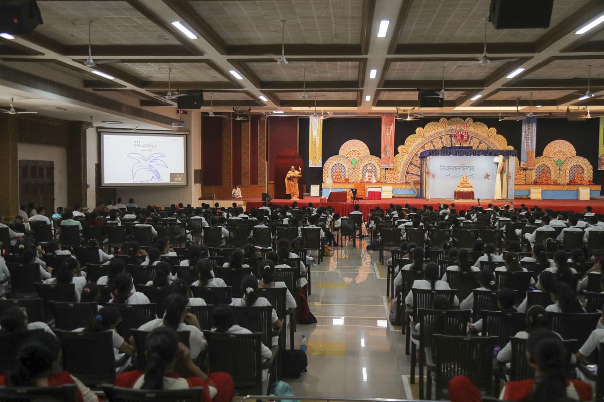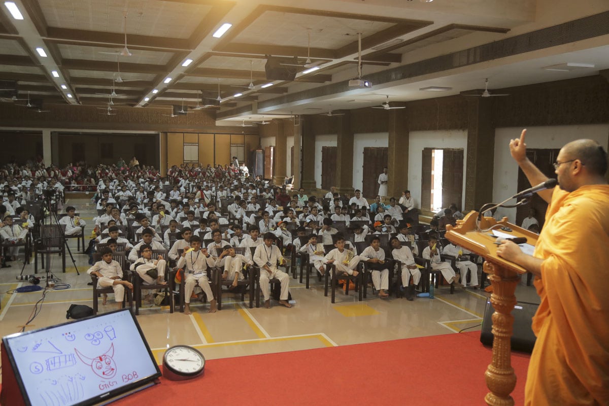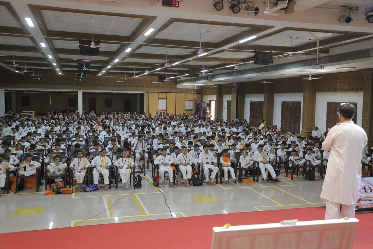 A parents meeting was arranged to explain the importance and benefits of the ‘Satsang Diksha Adhyayan’ and ‘Siddhanth Sarvasvam’ courses. Children received direct guidance from Pujya Viveksagardas Swami, Narayanmunidas Swami, Bhadreshdas Swami, and other senior scholar swamis.