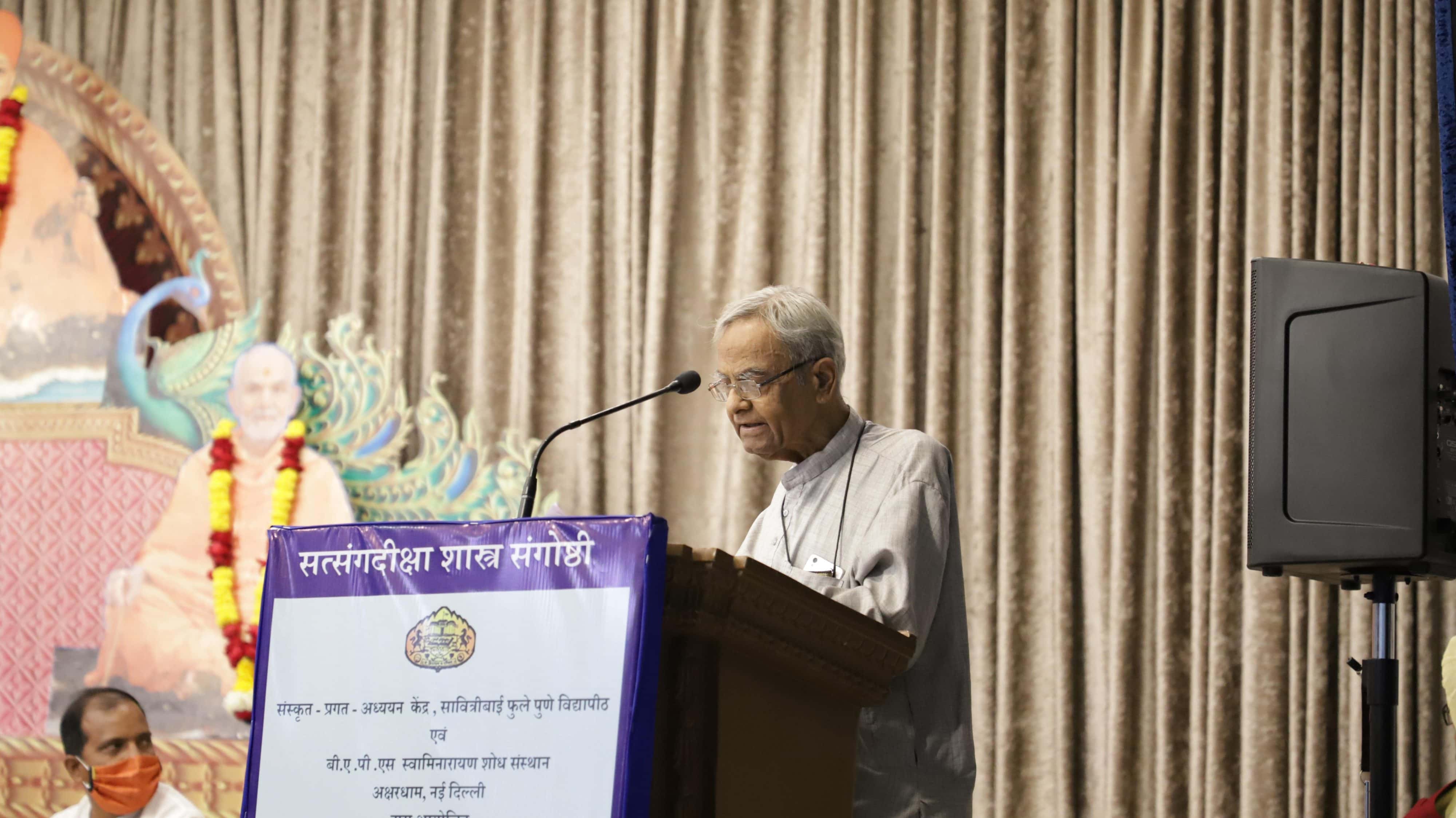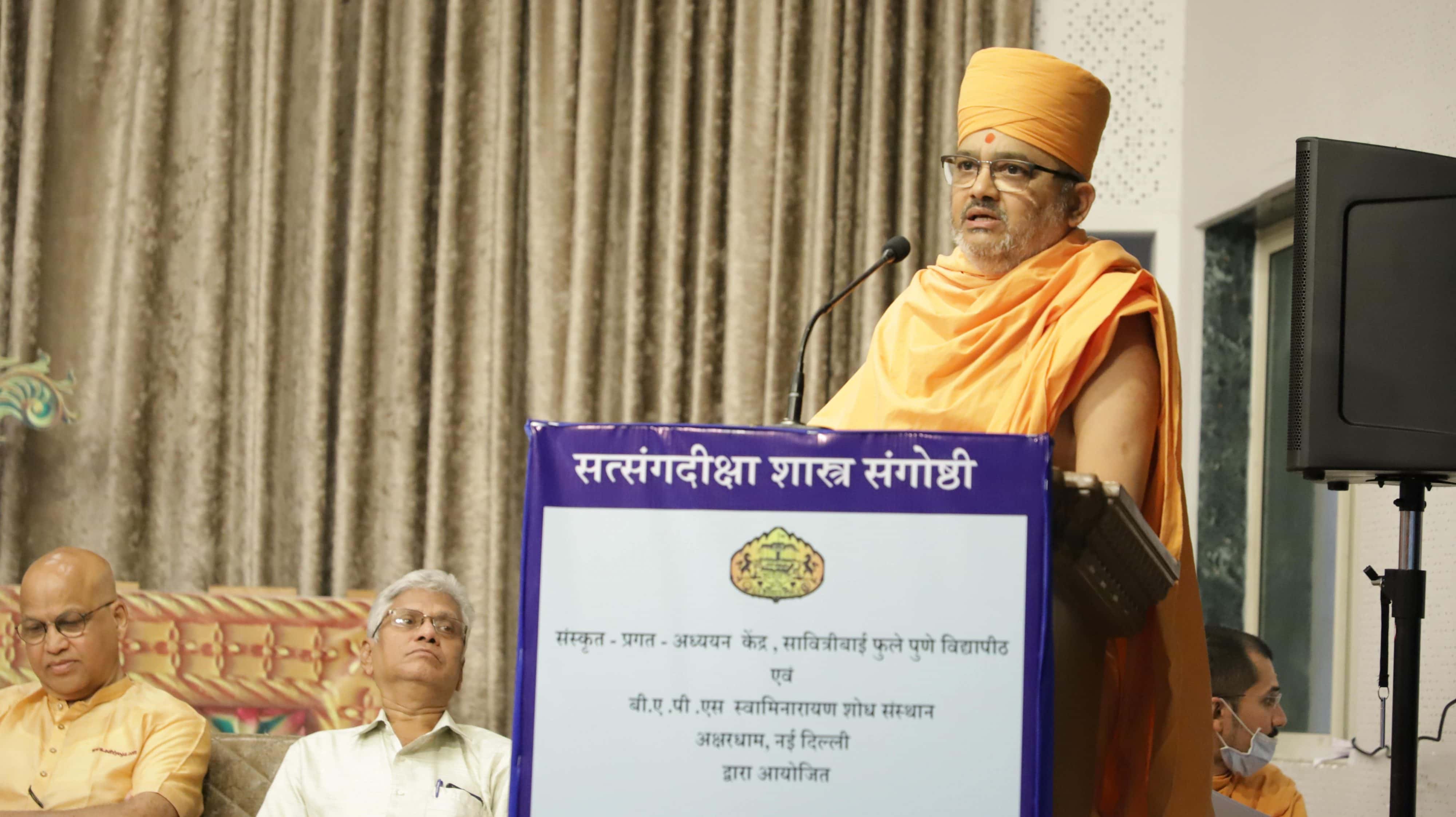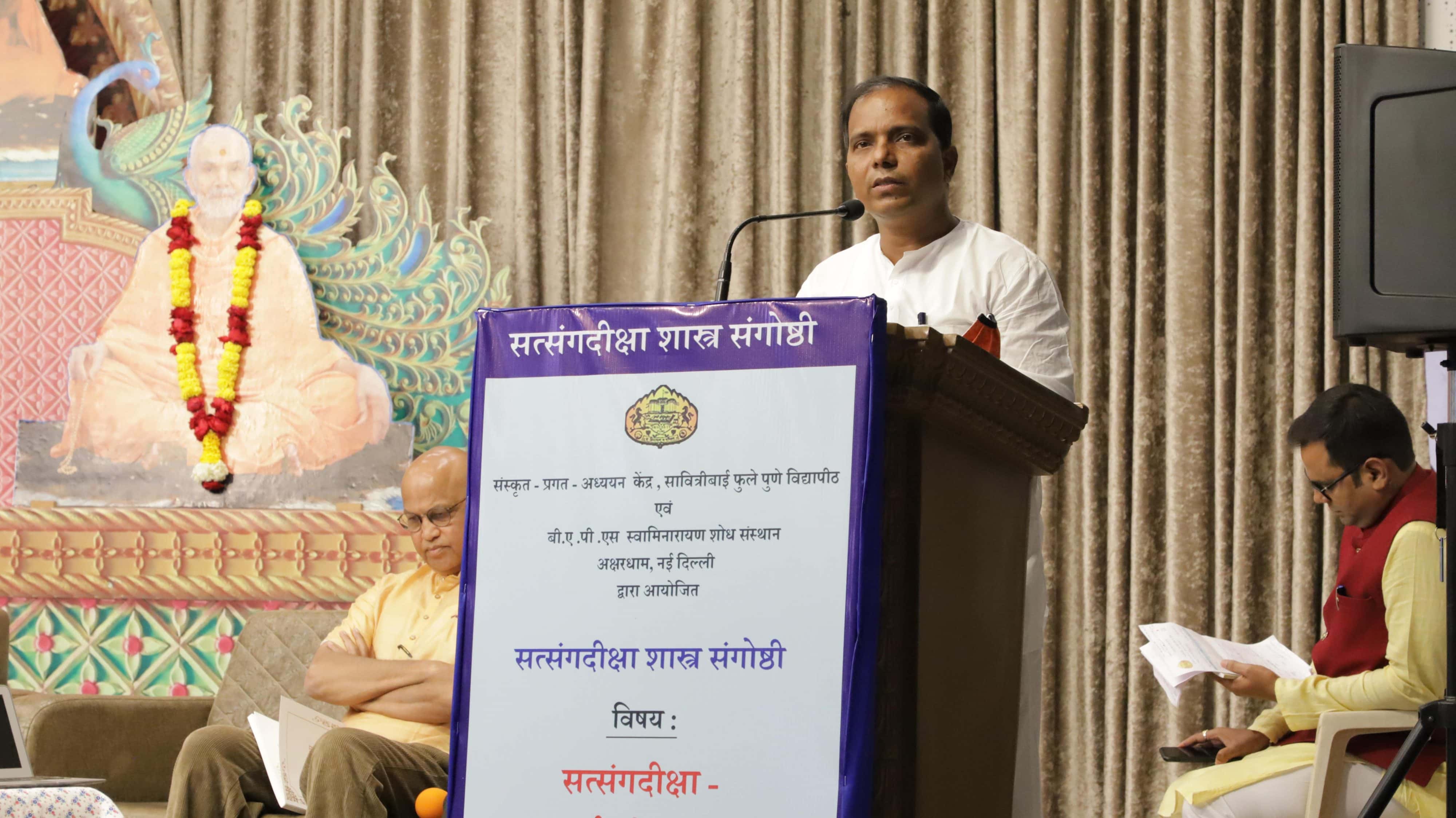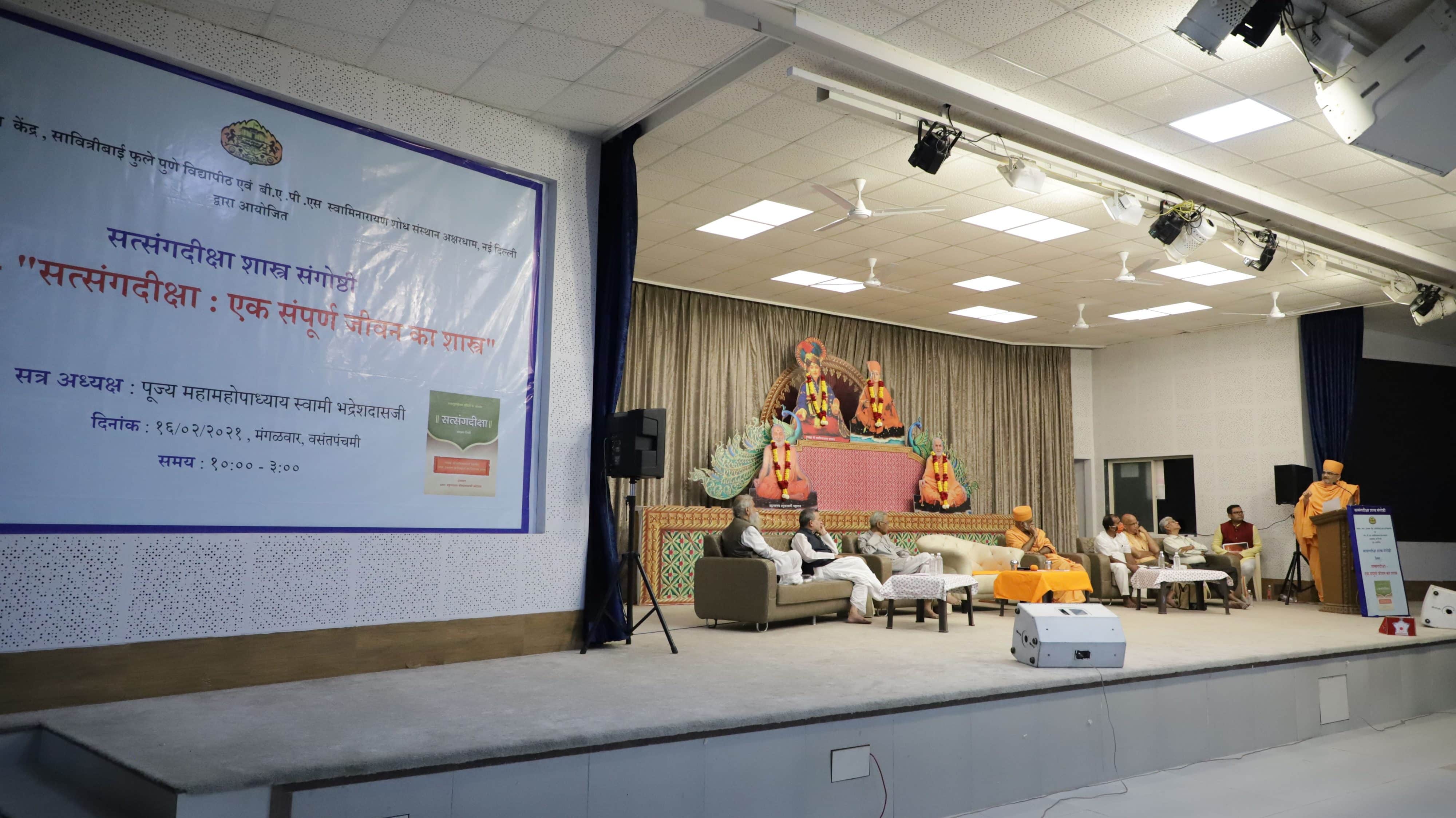 A conference on the Satsaṅgadīkṣā scripture was organized on Tuesday, 16 February 2021 by the Sanskrit Centre for Advanced Studies, Savitribai Fule Pune Vidyapeeth, and the BAPS Swaminarayan Research Institute, Swaminarayan Akshardham, New Delhi. In the presence of Mahāmahopādhyāya Bhadreshdas Swami, the conference was held at the BAPS Swaminarayan Mandir, Pune (Maharashtra) on the auspicious day of Vasanta Pañcamī. Titled “Satsaṅgadīkṣā: A Scripture for a Complete Life,” the conference hosted a series of presentations in which scholars offered their diverse perspectives on a variety of subjects.