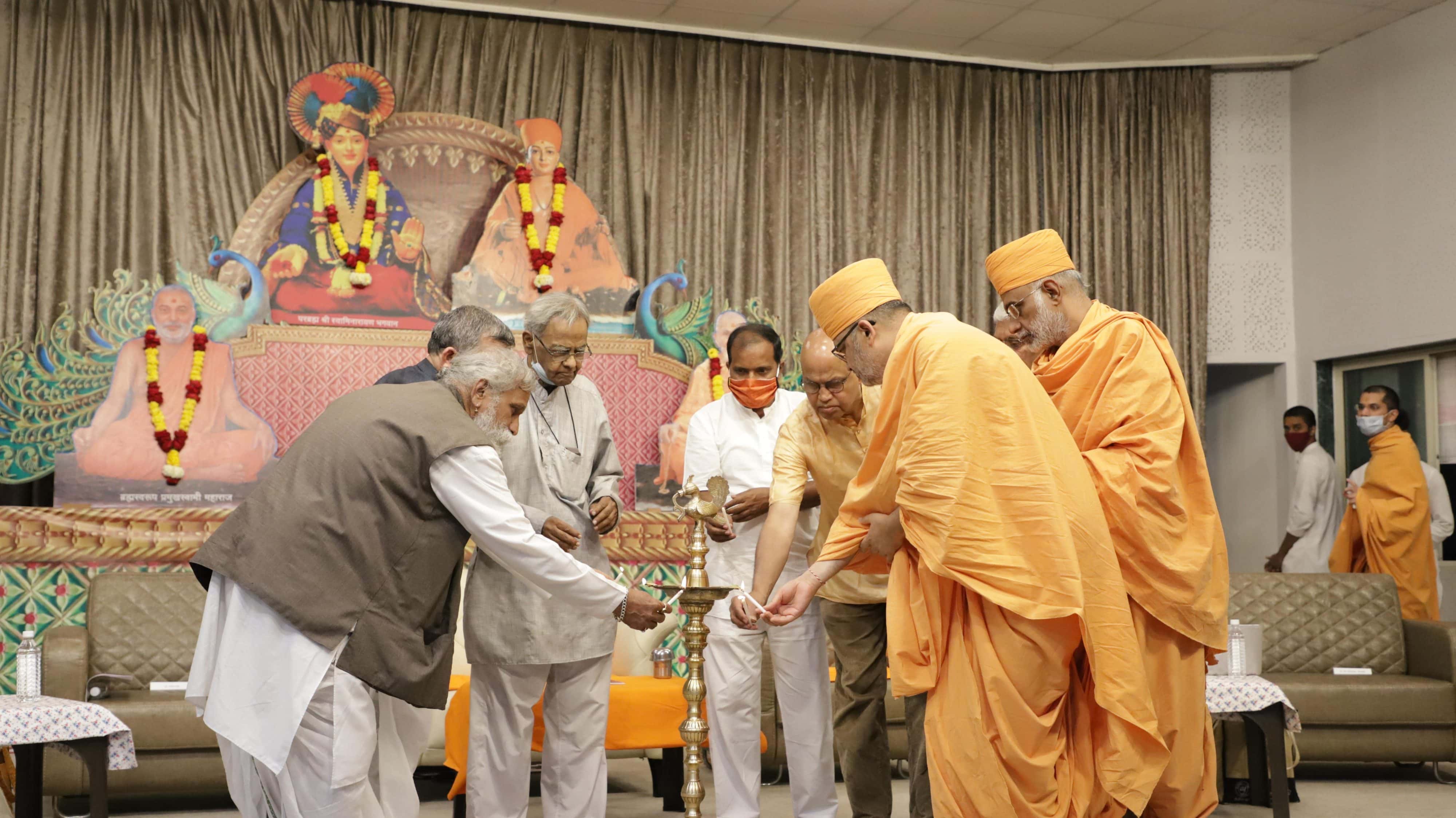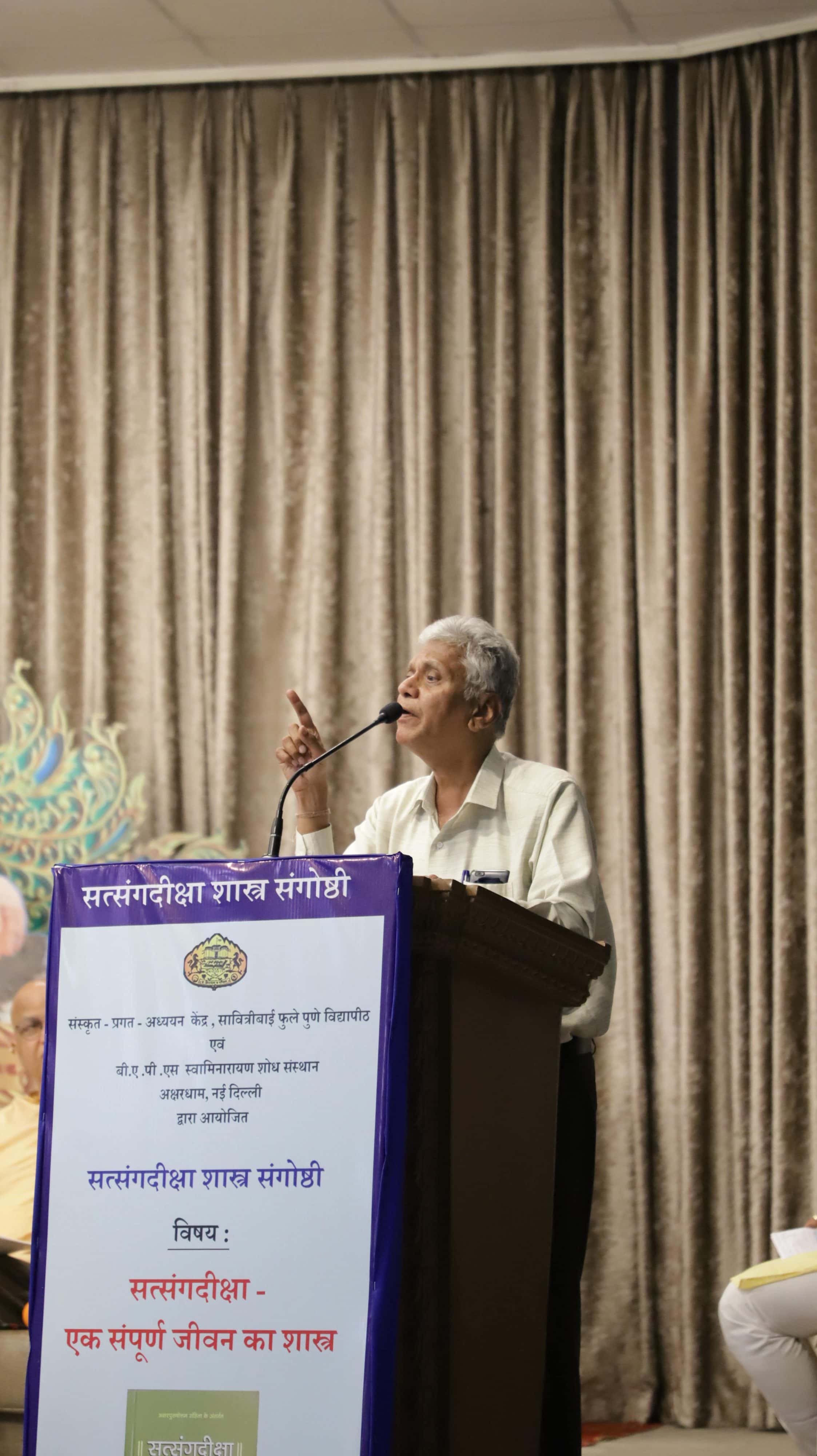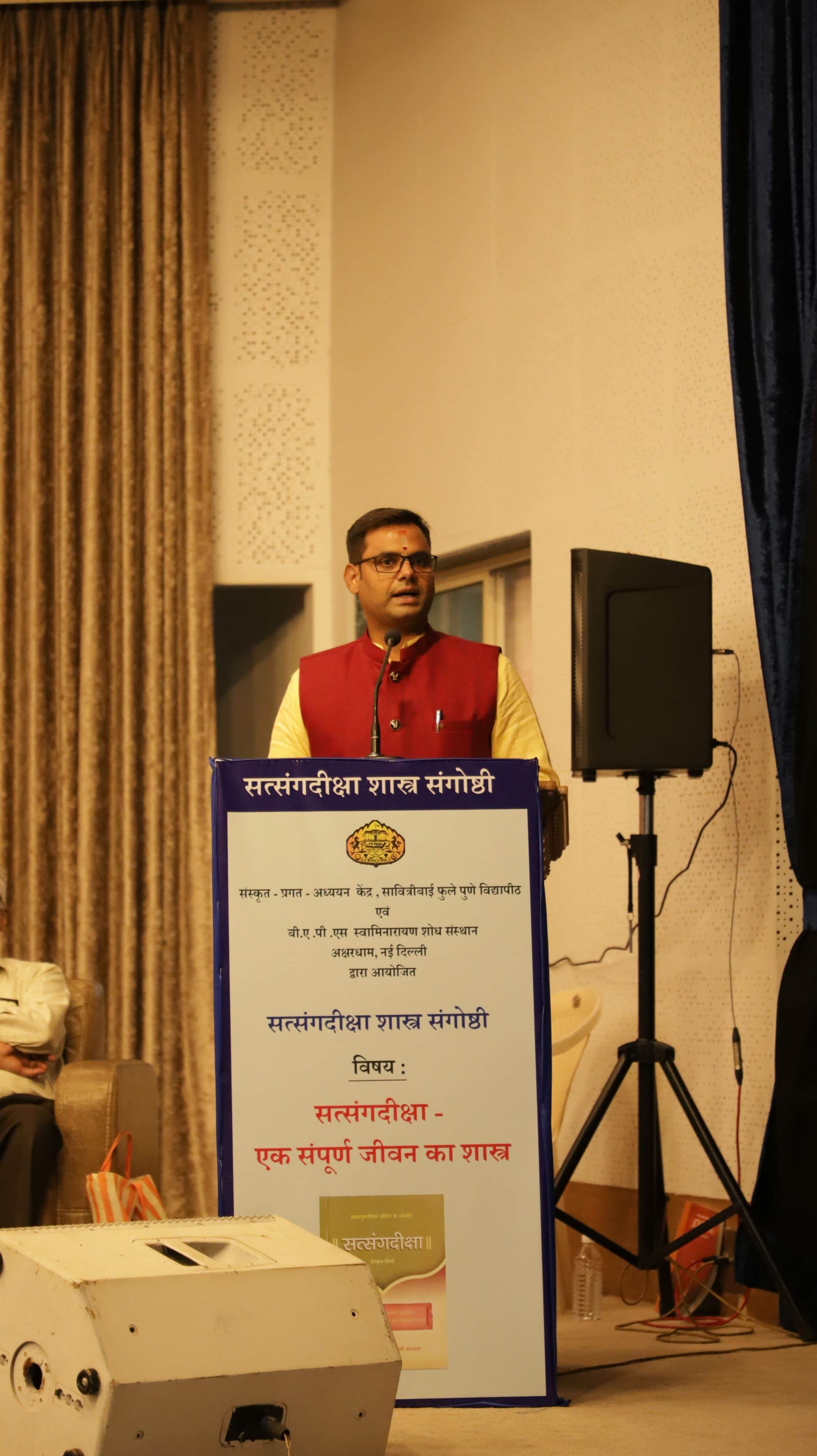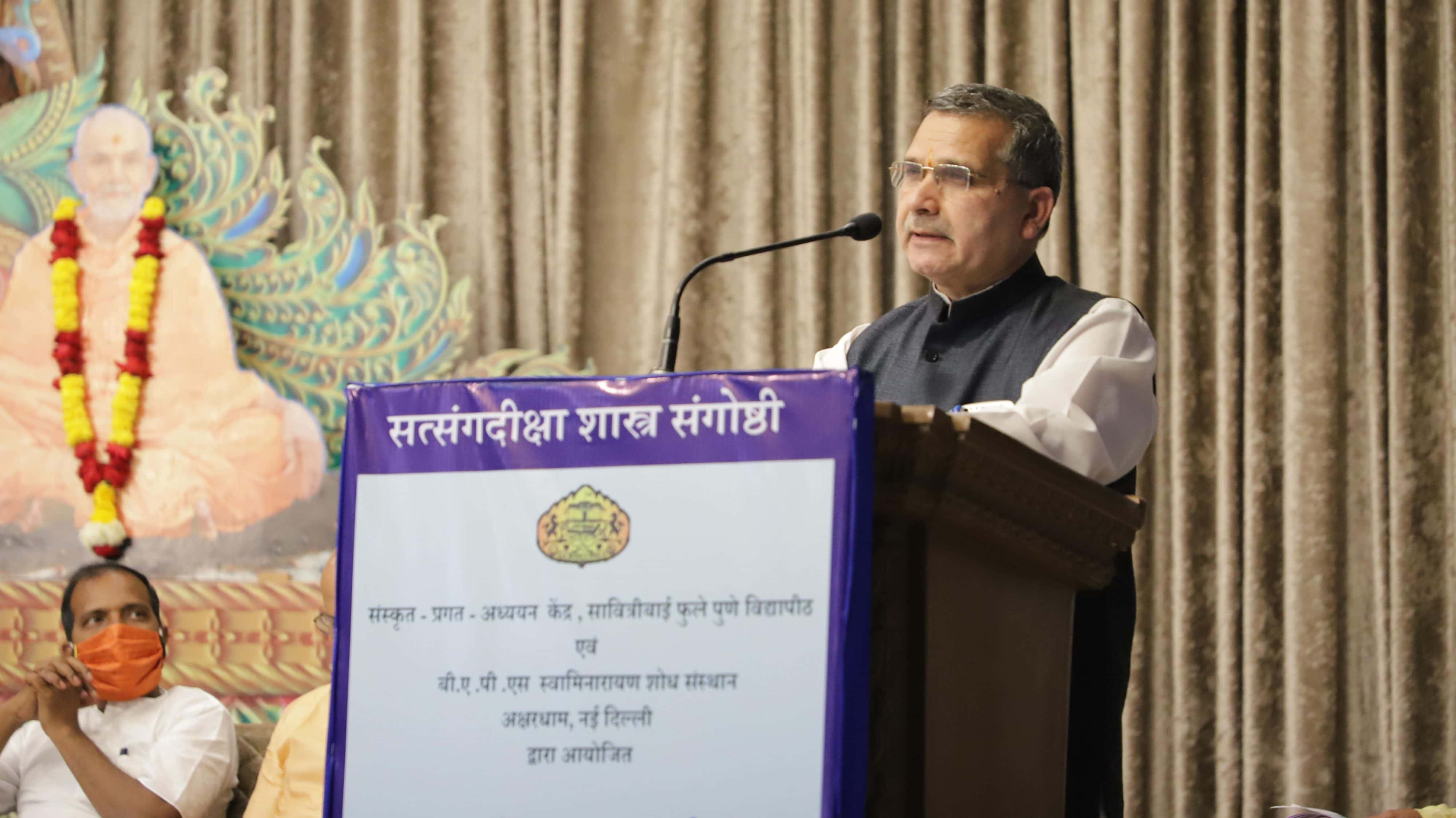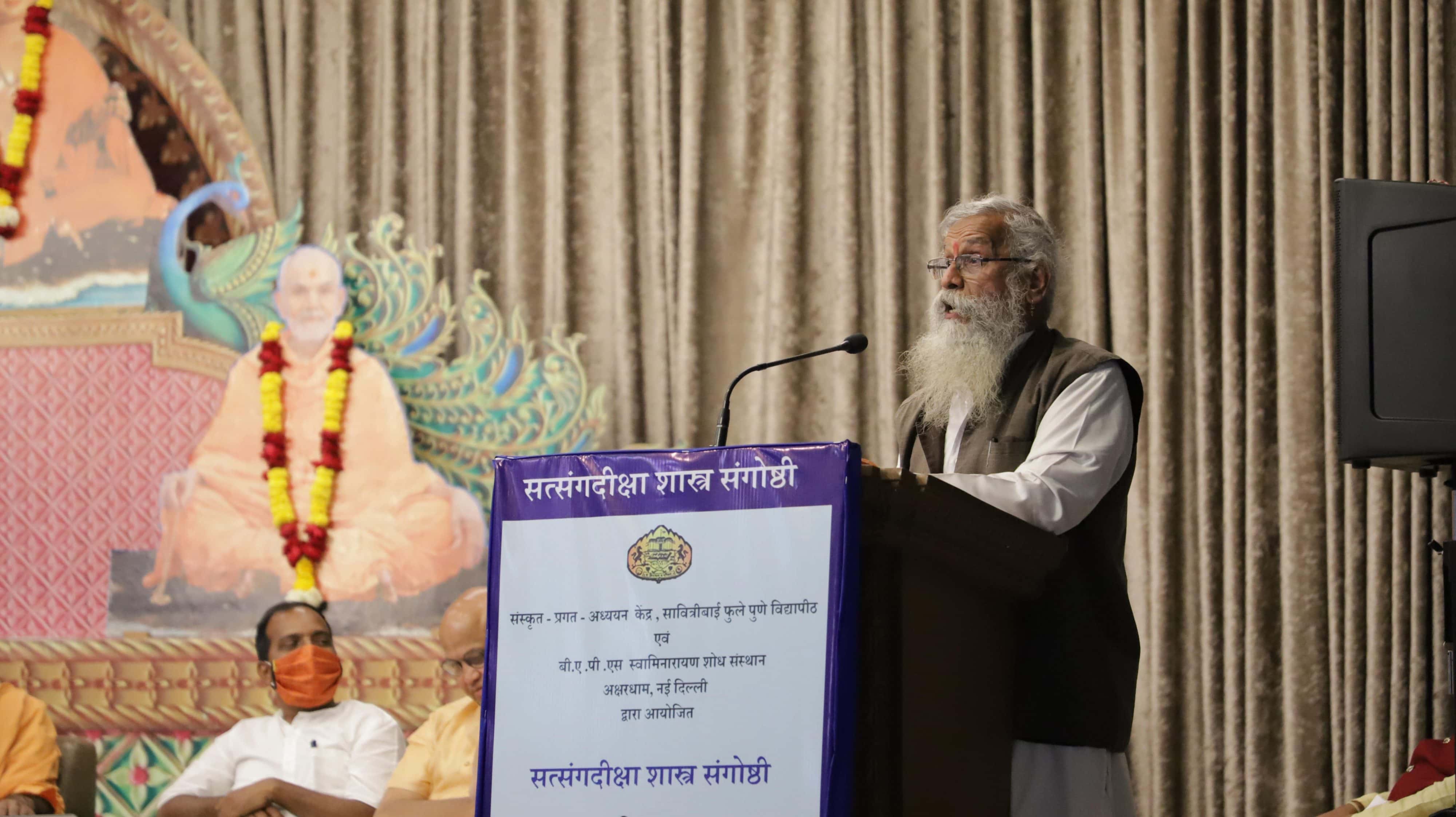 A conference on the Satsaṅgadīkṣā scripture was organized on Tuesday, 16 February 2021 by the Sanskrit Centre for Advanced Studies, Savitribai Fule Pune Vidyapeeth, and the BAPS Swaminarayan Research Institute, Swaminarayan Akshardham, New Delhi. In the presence of Mahāmahopādhyāya Bhadreshdas Swami, the conference was held at the BAPS Swaminarayan Mandir, Pune (Maharashtra) on the auspicious day of Vasanta Pañcamī. Titled “Satsaṅgadīkṣā: A Scripture for a Complete Life,” the conference hosted a series of presentations in which scholars offered their diverse perspectives on a variety of subjects.