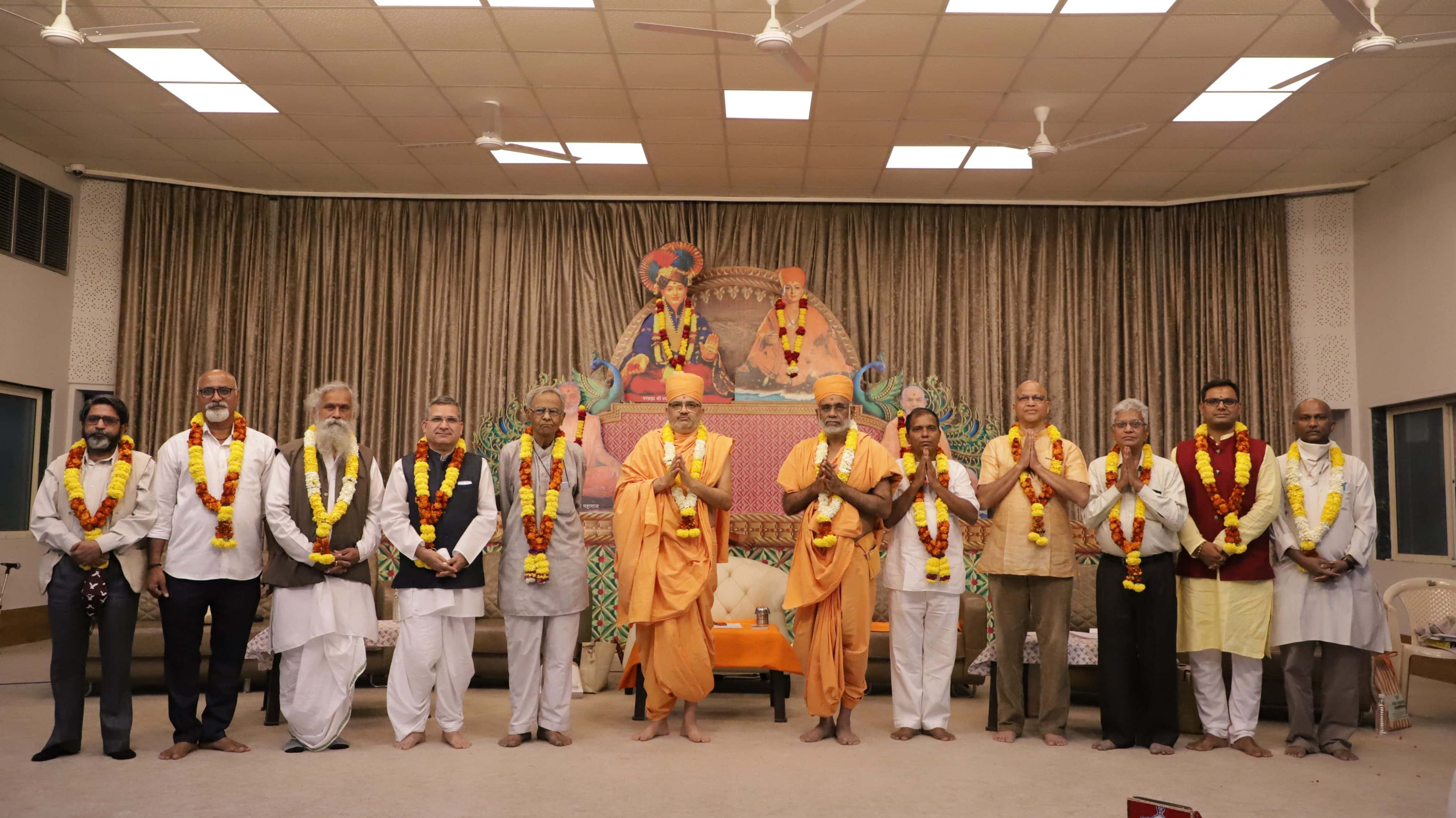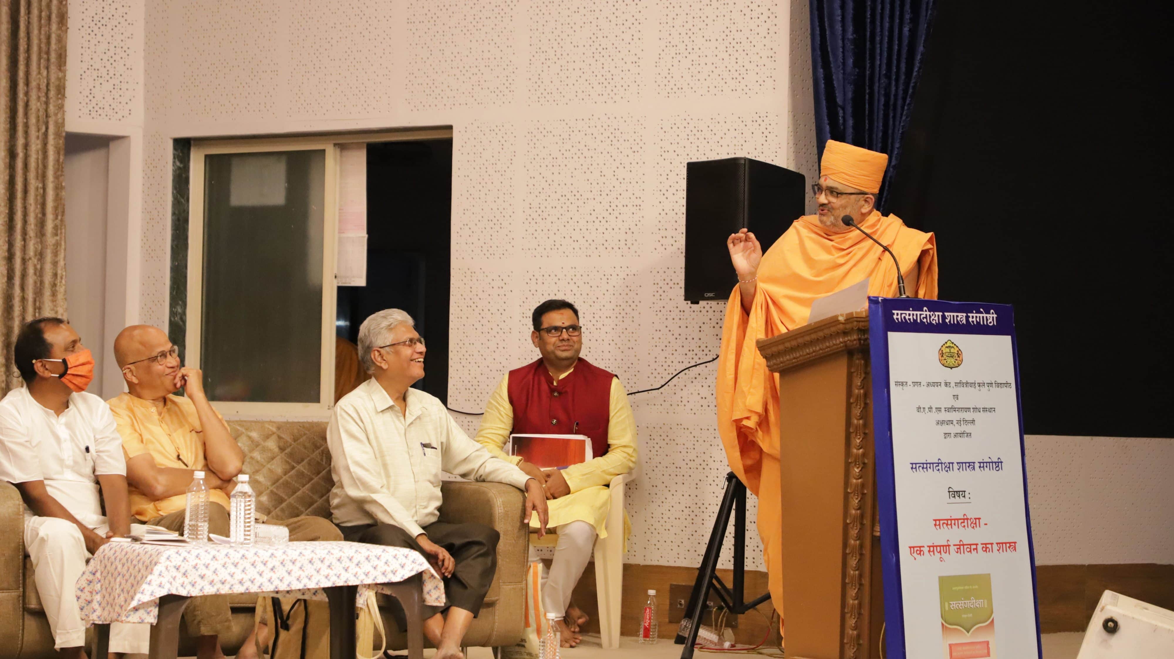 This first scholarly conference on the Satsaṅgadīkṣā was presided over by Mahāmahopādhyāya Bhadreshdas Swami. After the inaugural ceremonies, Dr. Gaṇeśa Thiṭejī commenced the conference by presenting an introductory address. Thereafter, Dr. Ravīndra Mulejī, Dr. Dattopāsakajī, Dr. Jāvaḍekarajī, Dr. Divākara Mohantījī, Dr. Nīla Kulakarṇījī, Dr. Dineśa Rasāla, and other scholars presented their research on the societal, pragmatic, spiritual, scholastic, and other features of the Satsaṅgadīkṣā scripture.