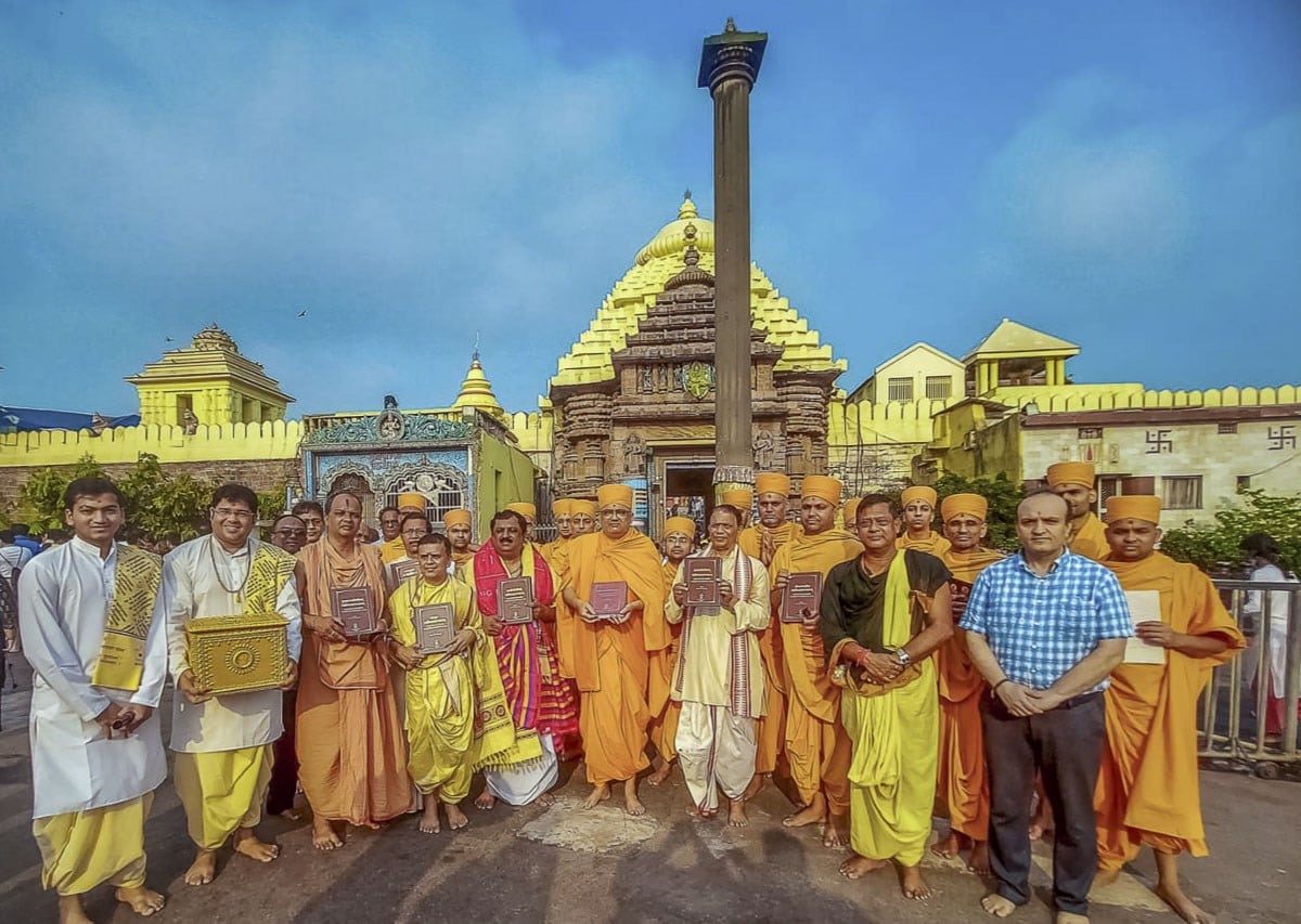 The morning of 21 March commenced with Mahāmahōpādhyāya Bhadreshdas Swami offering the Svāminārāyaṇabhāṣyam and the Svāminārāyaṇasiddhāntasudhā at the holy feet of Shri Jagannath in the temple. During this ceremonious offering all those present recited the ‘Jagannāthāṣṭakam,’ a poetic composition authored by Mahāmahōpādhyāya Bhadreshdas Swami consisting of eight Sanskrit verses exalting the glory of Shri Jagannath. This ceremony was acclaimed by present scholars and dignitaries as a historic event. Centuries ago Ādi Śaṅkarācārya offered his commentaries to Shri Jagannath and recited Sanskrit verses. After Śaṅkarācārya this was the first time a bhāṣyakāra offered his written Prasthānatrayī commentaries to Shri Jagannath while reciting Sanskrit verses that he himself composed.