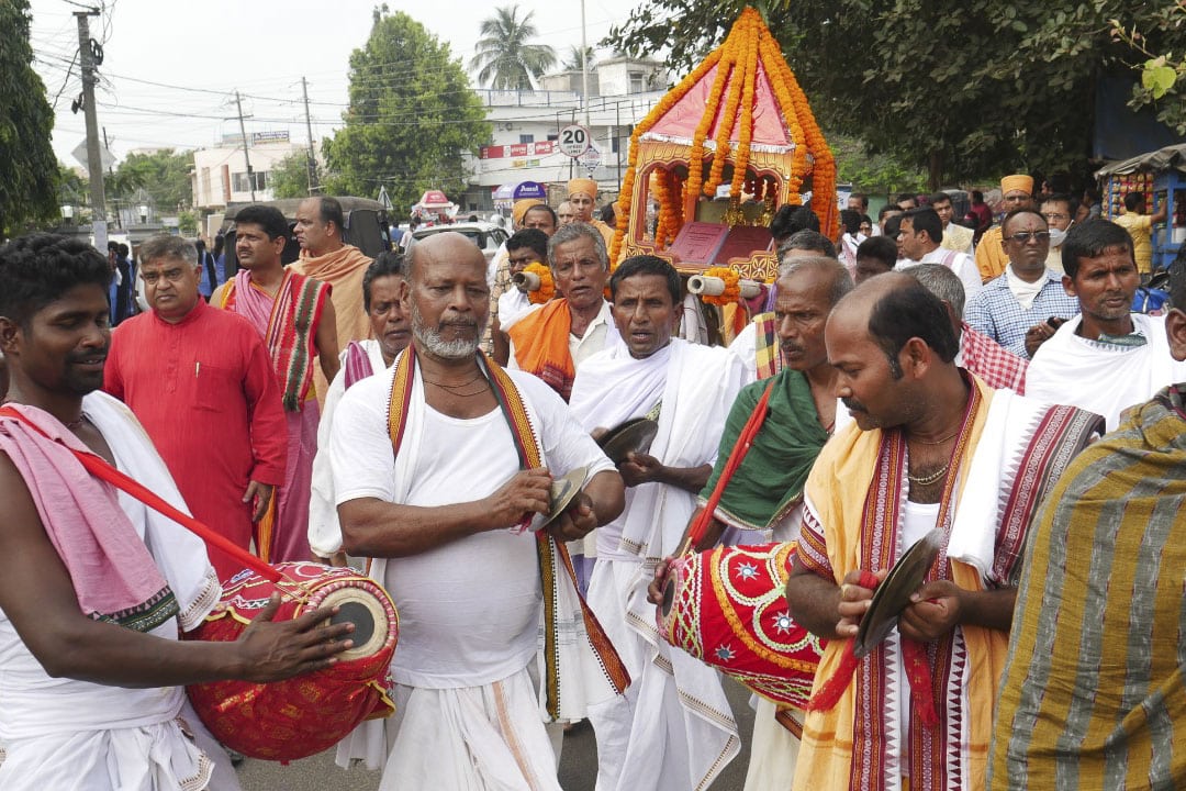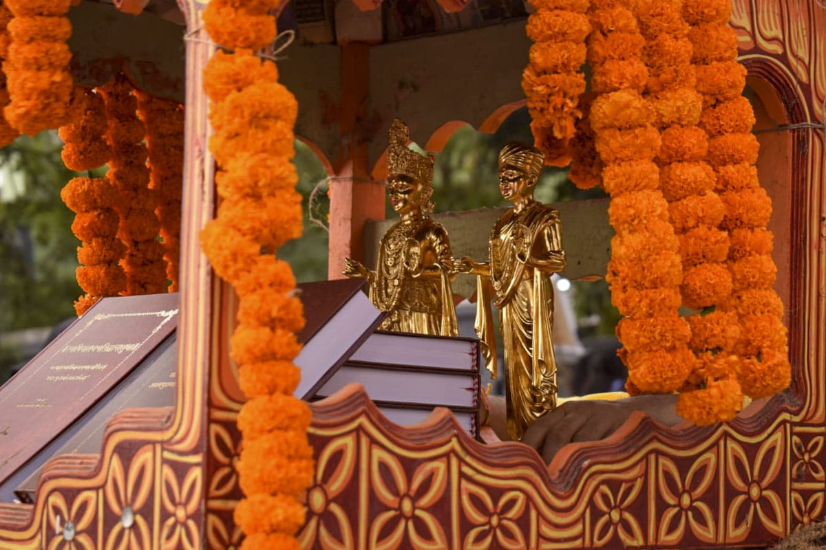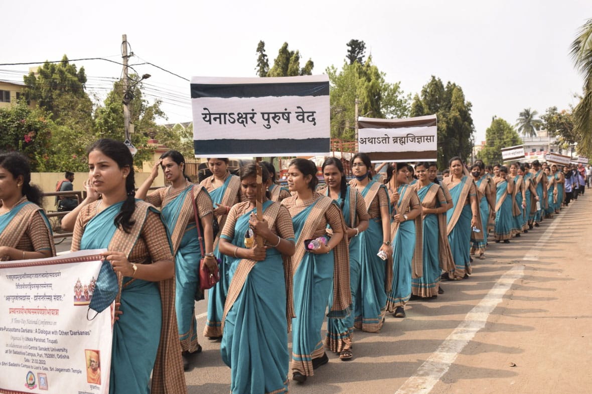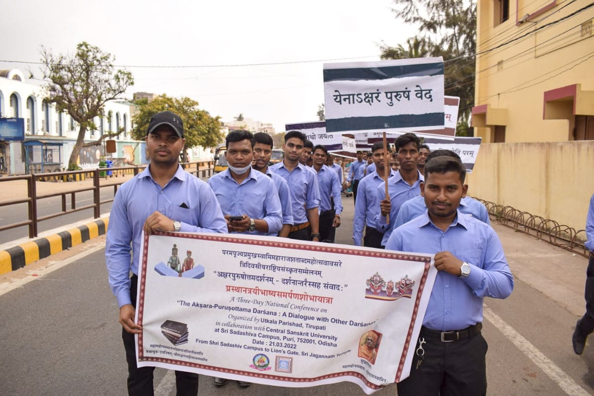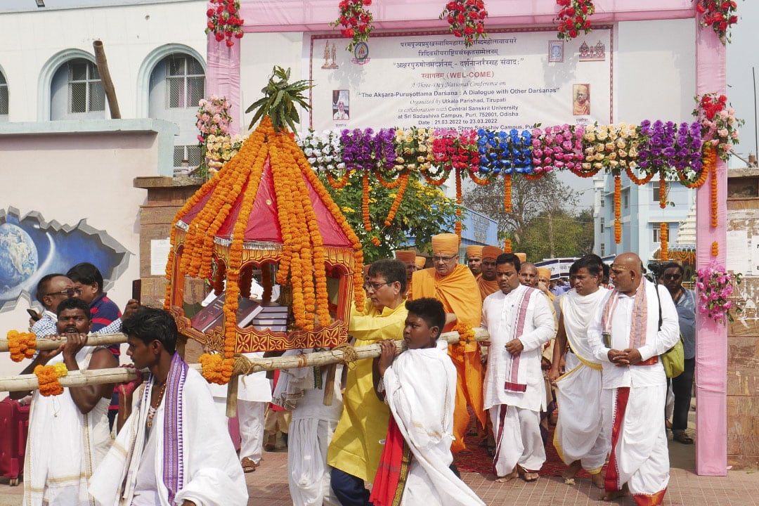 Thereafter, a traditional festive procession was organized within the university campus as a celebration of a novel dārśanic contribution to the Vedānta tradition. The metallic idols of Parabrahma Svāminārāyaṇa and Akṣarabrahma Gunatitanand Swami along with the Svāminārāyaṇabhāṣyam and Svāminārāyaṇasiddhāntasudhā texts were carried in a decorative palanquin throughout the campus and on the streets of Puri. During the procession traditional Odisha singers sang devotional bhajans while scholars and students recited Vedic mantras.