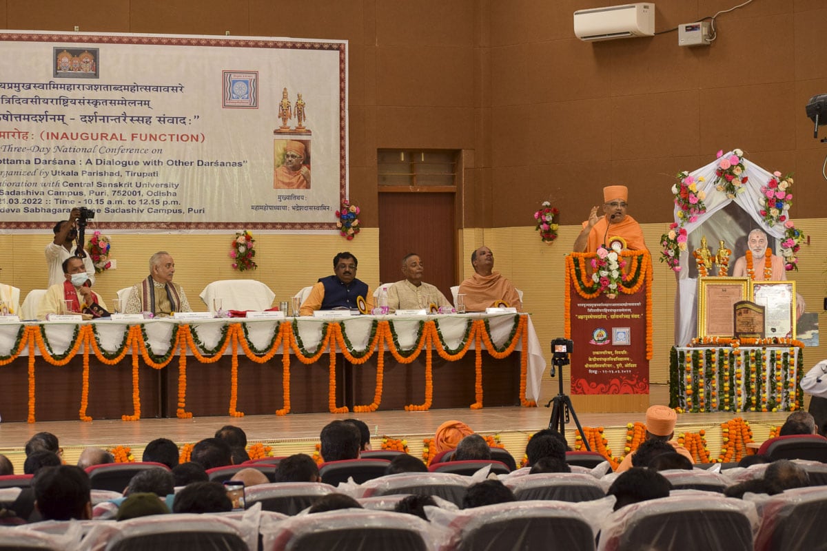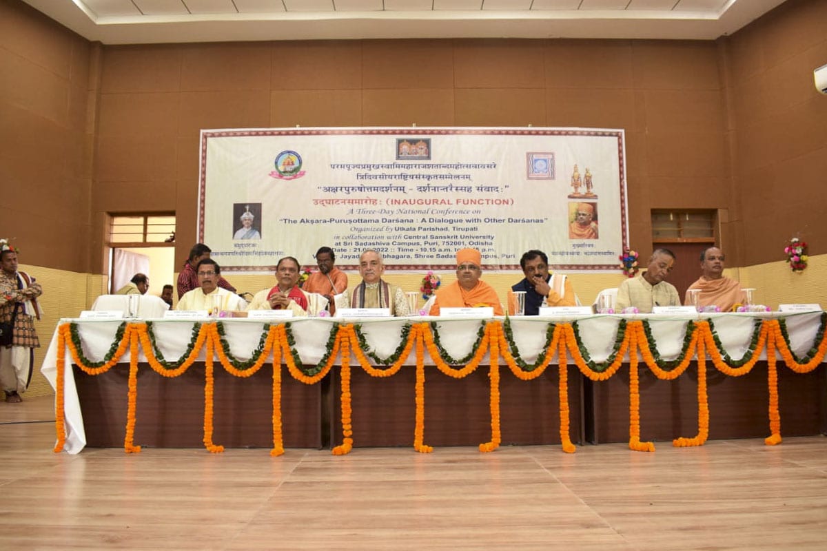 On March 21 2022, a three-day national academic conference entitled ‘The Akṣarapuruṣōttama Darśana: A Dialogue with Other Darśanas’ was organized at the Central Sanskrit University, Sadashiva Campus in Puri, Odisha. This conference provided a unique opportunity for scholars of East India to gain a deeper insight into Parabrahma Svāminārāyaṇa’s novel Vedic doctrine. This event also encompassed the commemoration of Pramukh Swami Maharaj’s work on the occasion of his centenary birth celebrations, the felicitation of Mahāmahōpādhyāya Bhadreshdas Swami, and the commendation of the Akṣarapuruṣōttama Darśana as a distinct Vedic darśana.