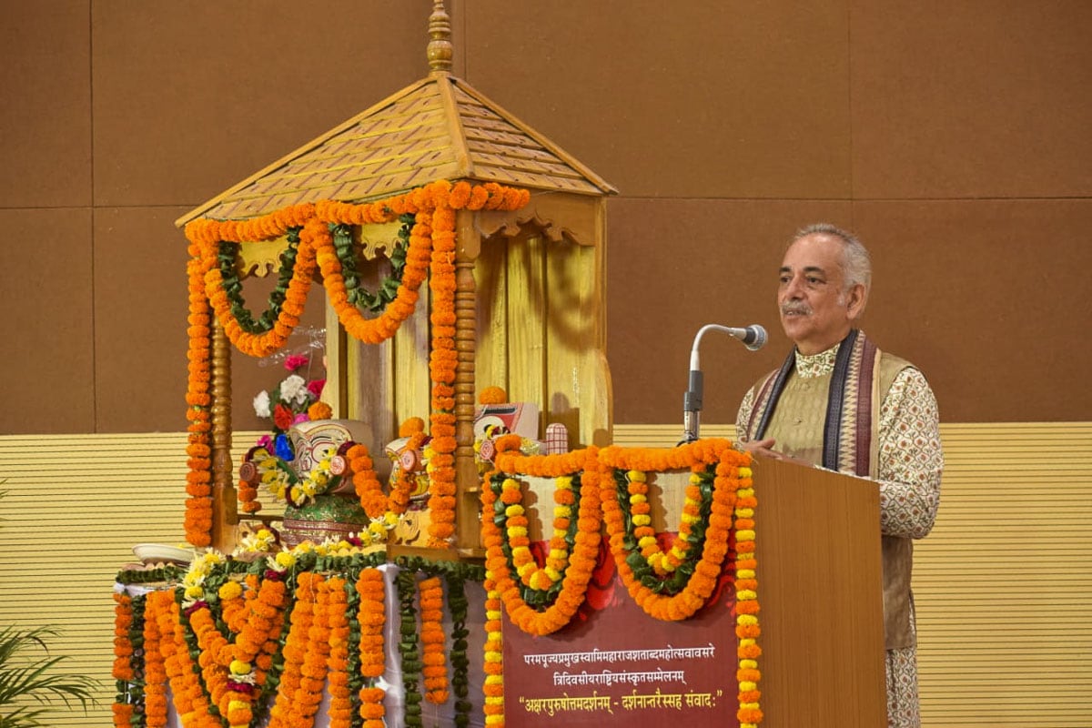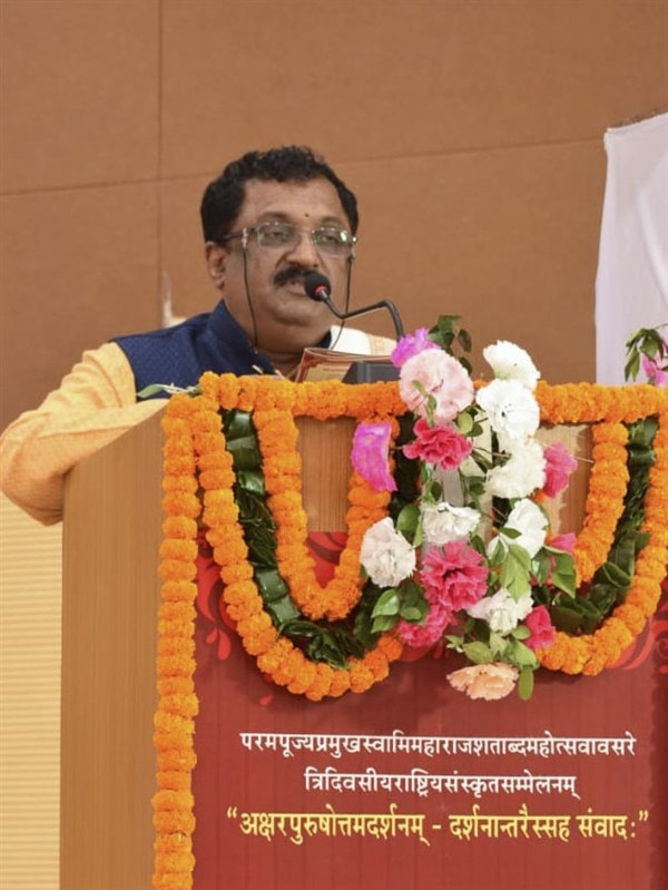 This commentary does not criticize any school of thought. Rather, it substantiates its own position upon expressing reverence towards everyone. This is the reason why we have all gathered to welcome and honour this commentary. We have experienced a glimpse of only one disciple of Pramukh Swami Maharaj. There are one thousand such sadhus, more than a thousand mandirs, and numerous educational institutions. Pramukh Swami Maharaj inspired the creation of the Prasthānatrayī commentaries. Hence, his felicitation will be forever etched in the history of this university.