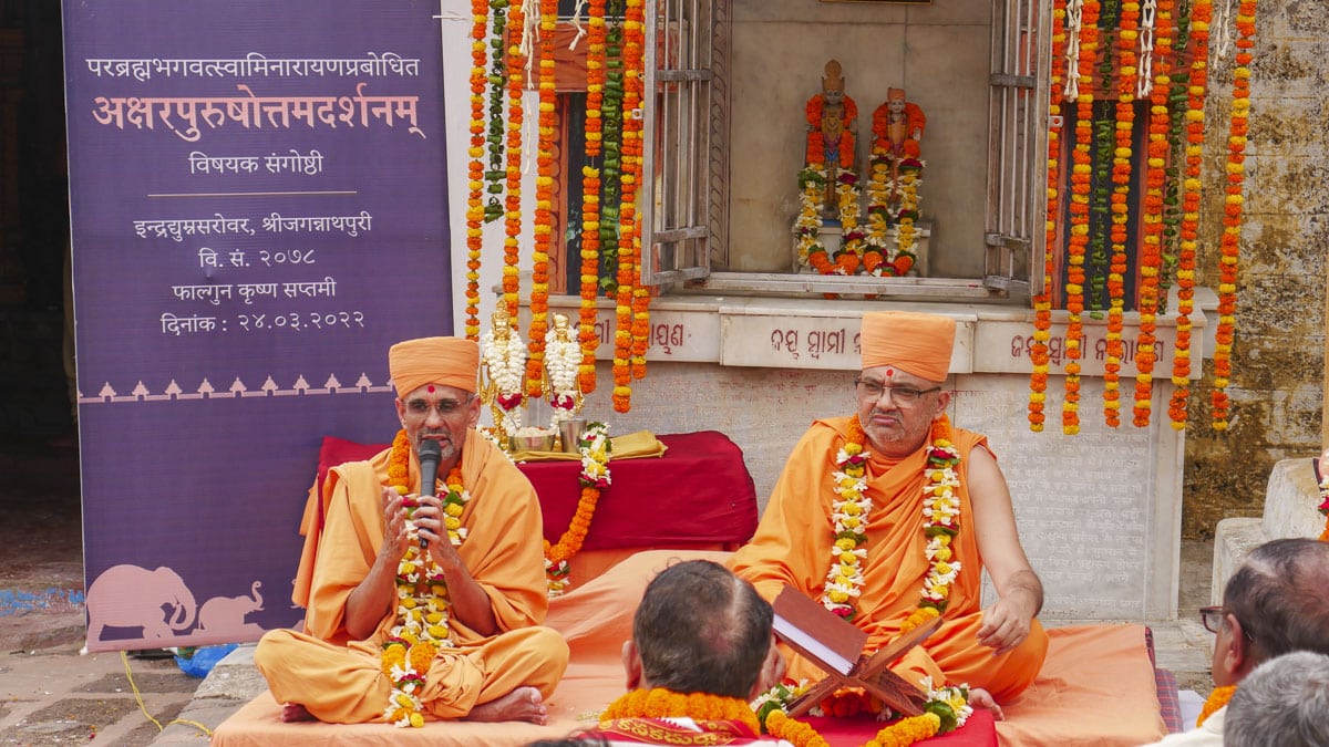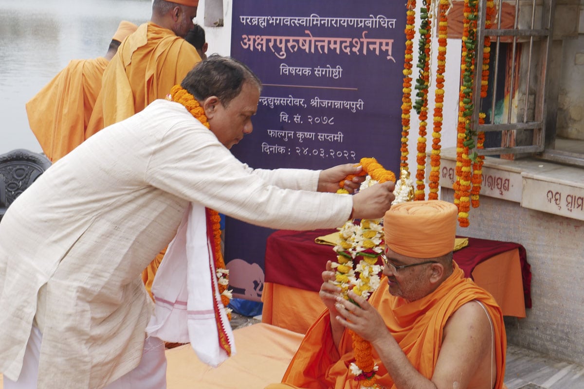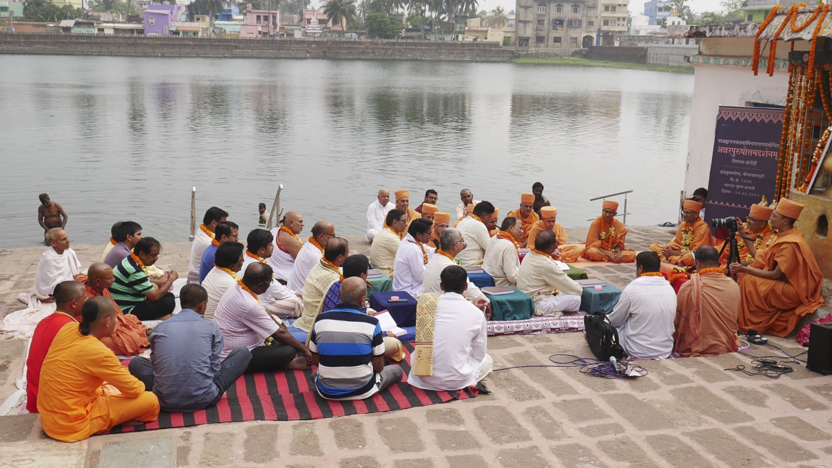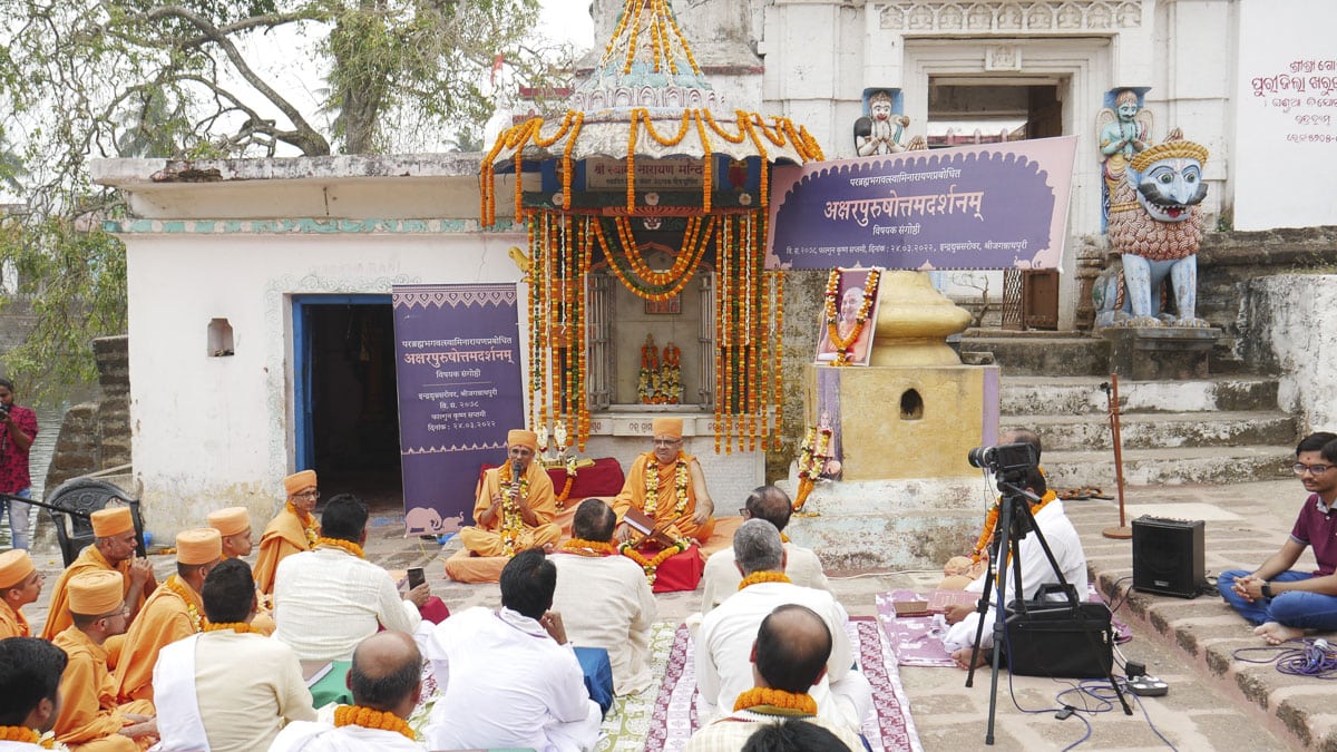 On March 24, 2022, a historic discourse on the Shrimad Bhagavad Gita Swaminarayan Bhashyam was held on the banks of the sacred Indradyumna Sarovar. Bhagwan Swaminarayan visited this ancient pilgrim place in 1797–1798 CE (Samvat 1853–1854). During his six-month stay in Jagannath Puri, he further sanctified the sarovar on numerous occasions by bathing in its holy waters. In memory of his stay, a small shrine that housed the murtis of Akshar-Purushottam Maharaj was consecrated. A colloquium attended by distinguished scholars of East India was organized to commemorate Bhagwan Swaminarayan’s discourses on the principles of the Akshar-Purushottam that transpired at this location.
