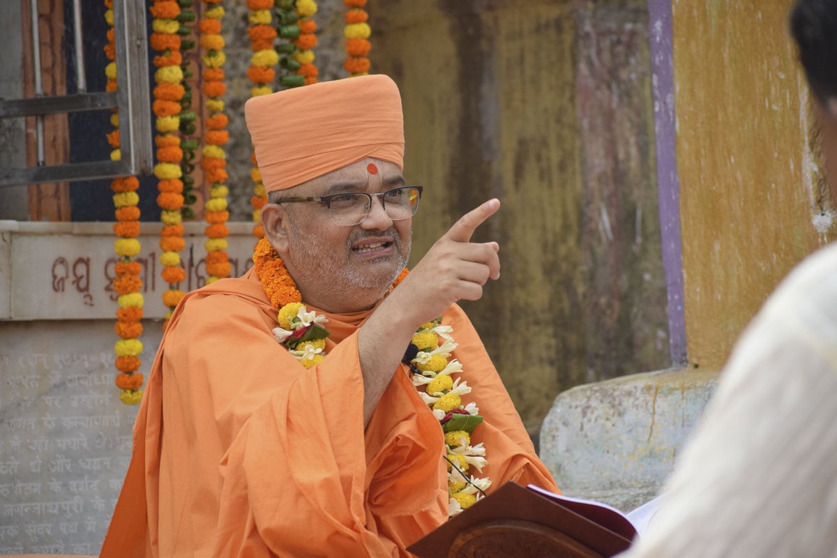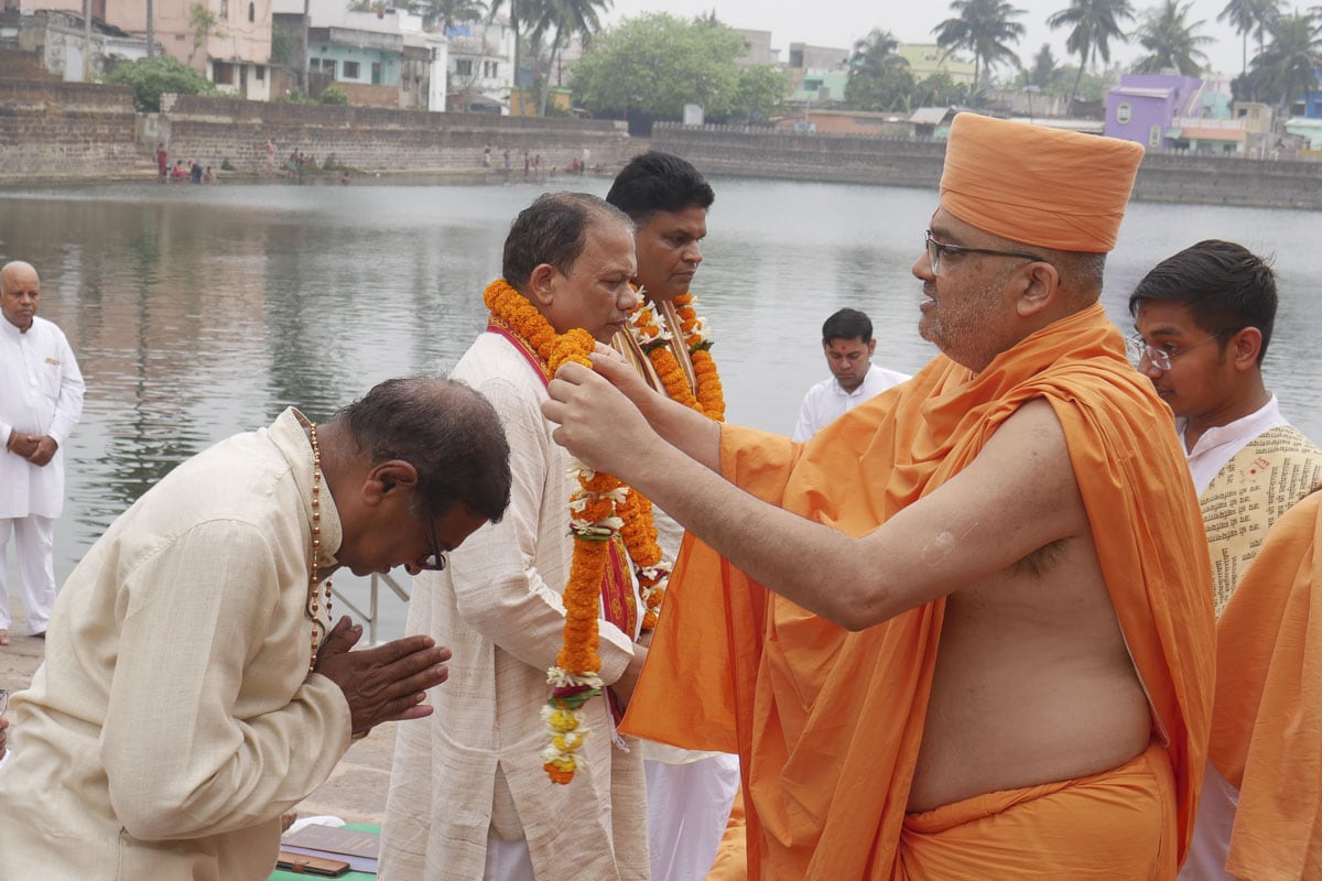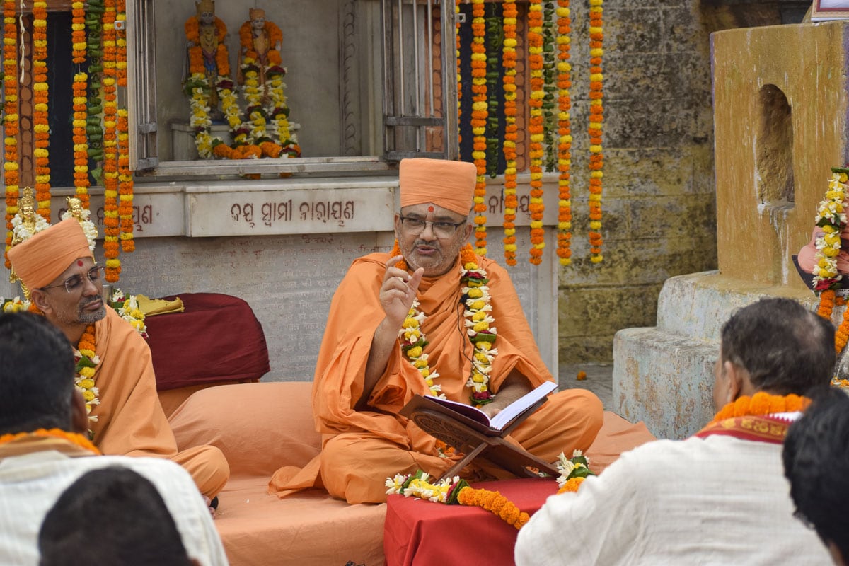 On March 24, 2022, a historic discourse on the Shrimad Bhagavad Gita Swaminarayan Bhashyam was held on the banks of the sacred Indradyumna Sarovar. Bhagwan Swaminarayan visited this ancient pilgrim place in 1797–1798 CE (Samvat 1853–1854). During his six-month stay in Jagannath Puri, he further sanctified the sarovar on numerous occasions by bathing in its holy waters. In memory of his stay, a small shrine that housed the murtis of Akshar-Purushottam Maharaj was consecrated. A colloquium attended by distinguished scholars of East India was organized to commemorate Bhagwan Swaminarayan’s discourses on the principles of the Akshar-Purushottam that transpired at this location.