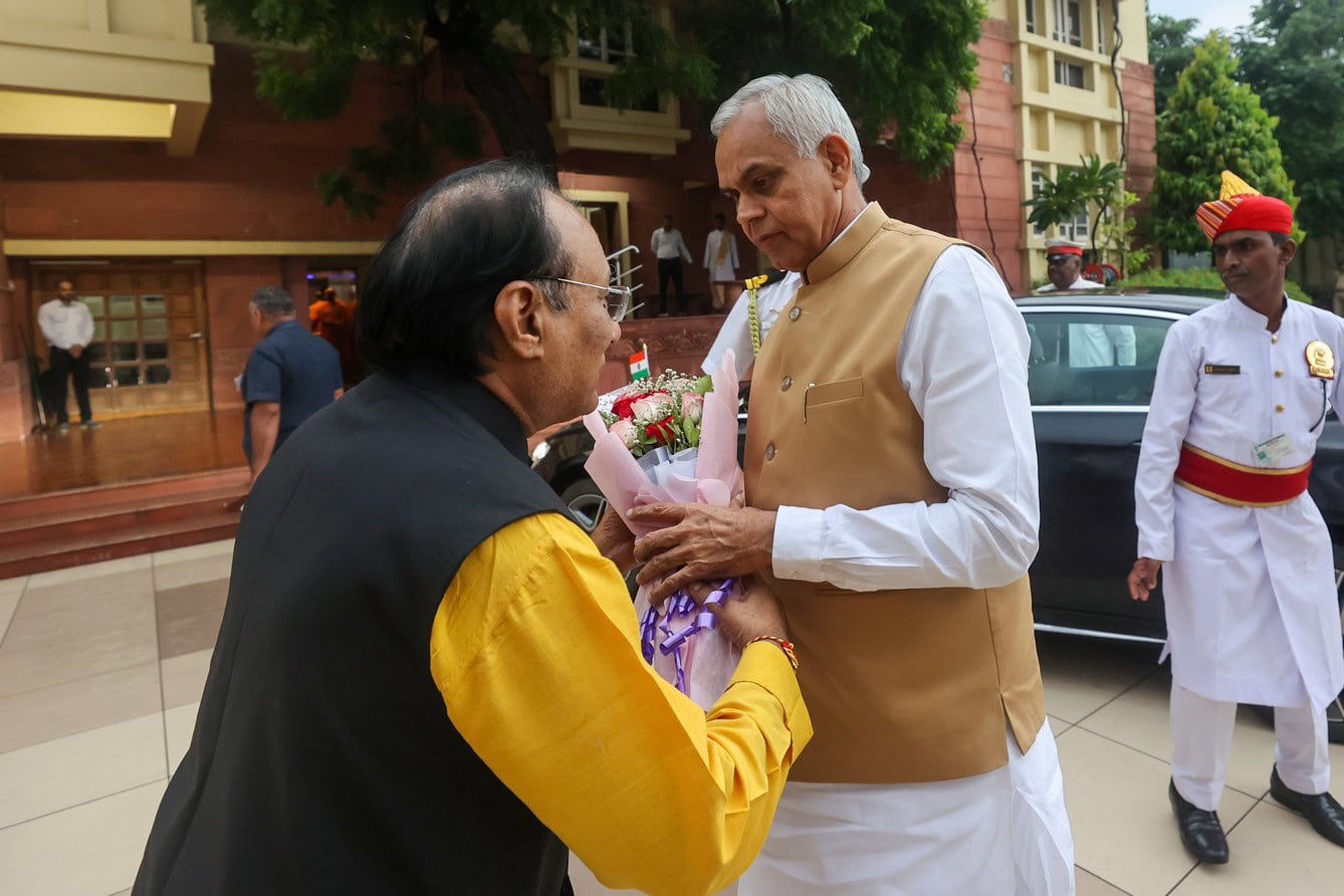 Dr. Sunil Joshi welcomes Hon. Governor of Gujarat and Maharashtra Shri Acharya Devvratji with a bouquet