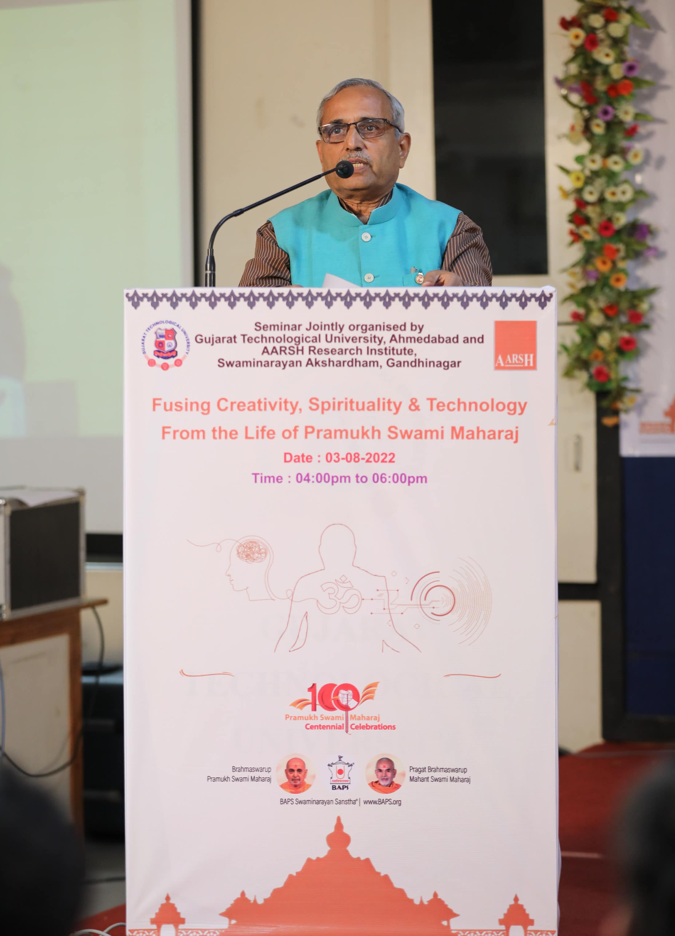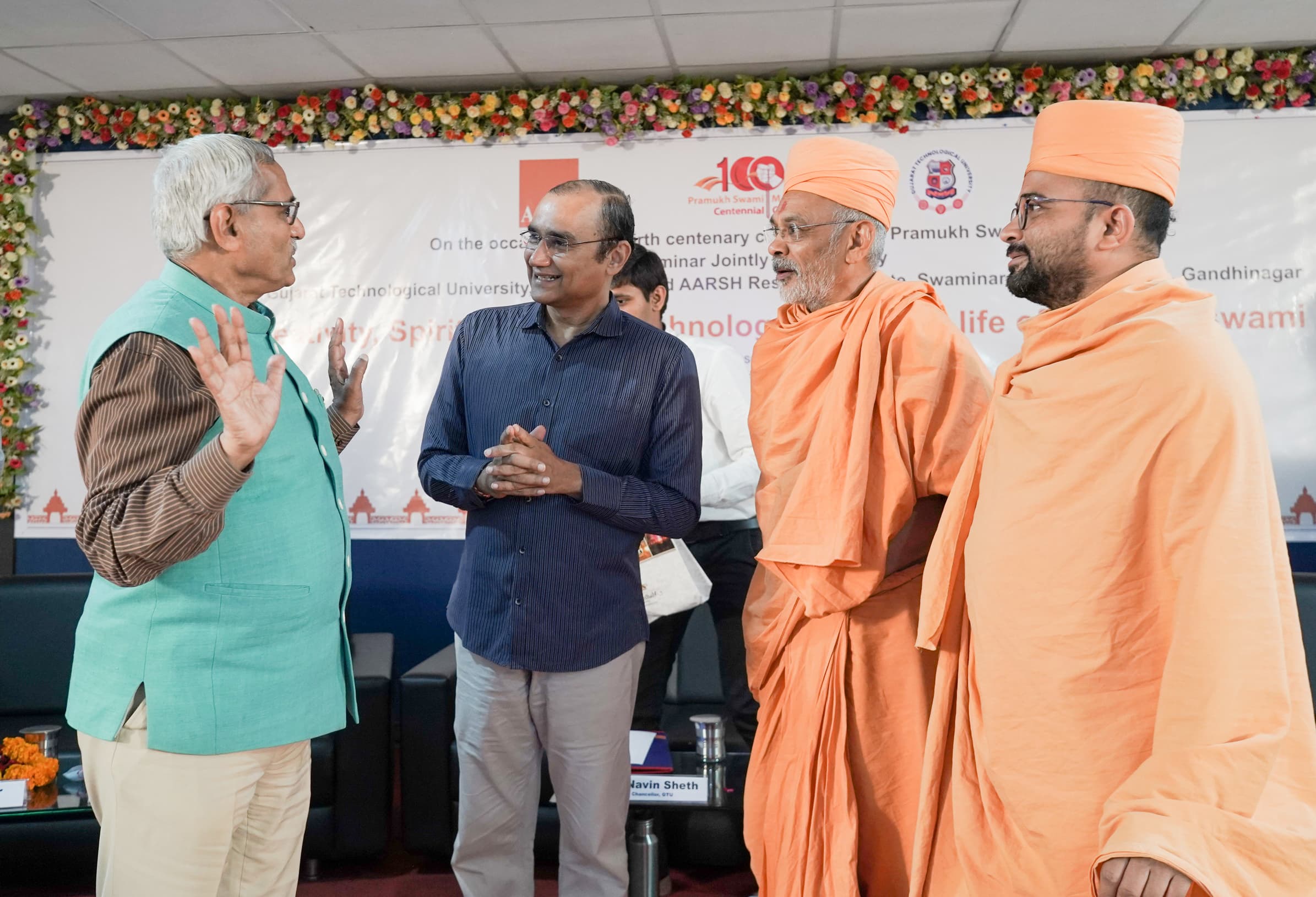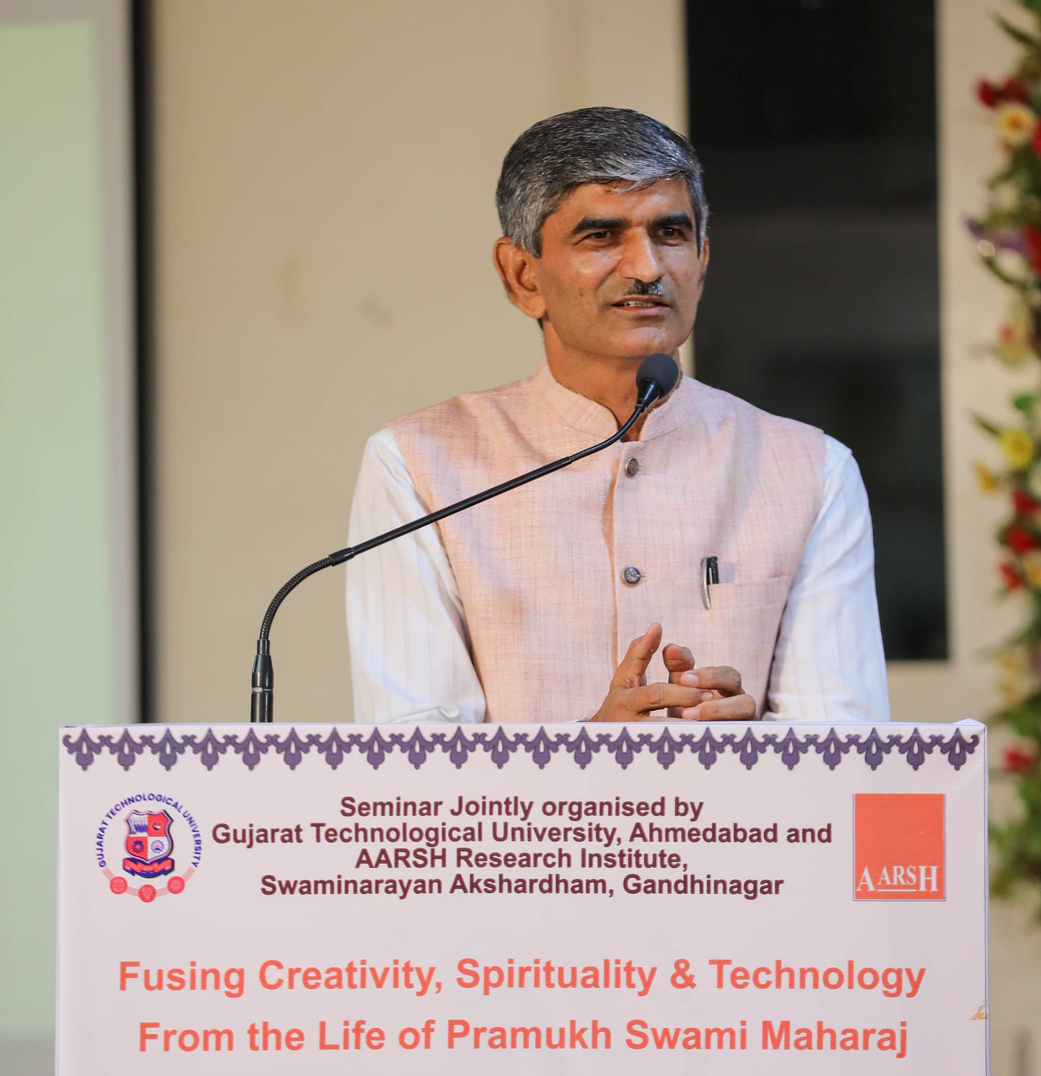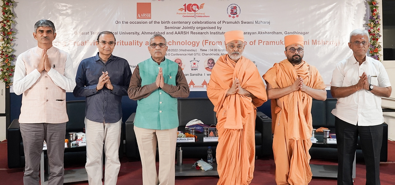 Under the auspices of the Brahmaswarup Pramukh Swami Maharaj Centenary Celebrations, Gujarat Technological University (GTU), Ahmedabad, in association with AARSH Research Institute, Swaminarayan Akshardham, Gandhinagar, organized a seminar on the topic ‘Fusing Creativity, Spirituality and Technology: From the life of Pramukh Swami Maharaj’ in the GTU conference hall.