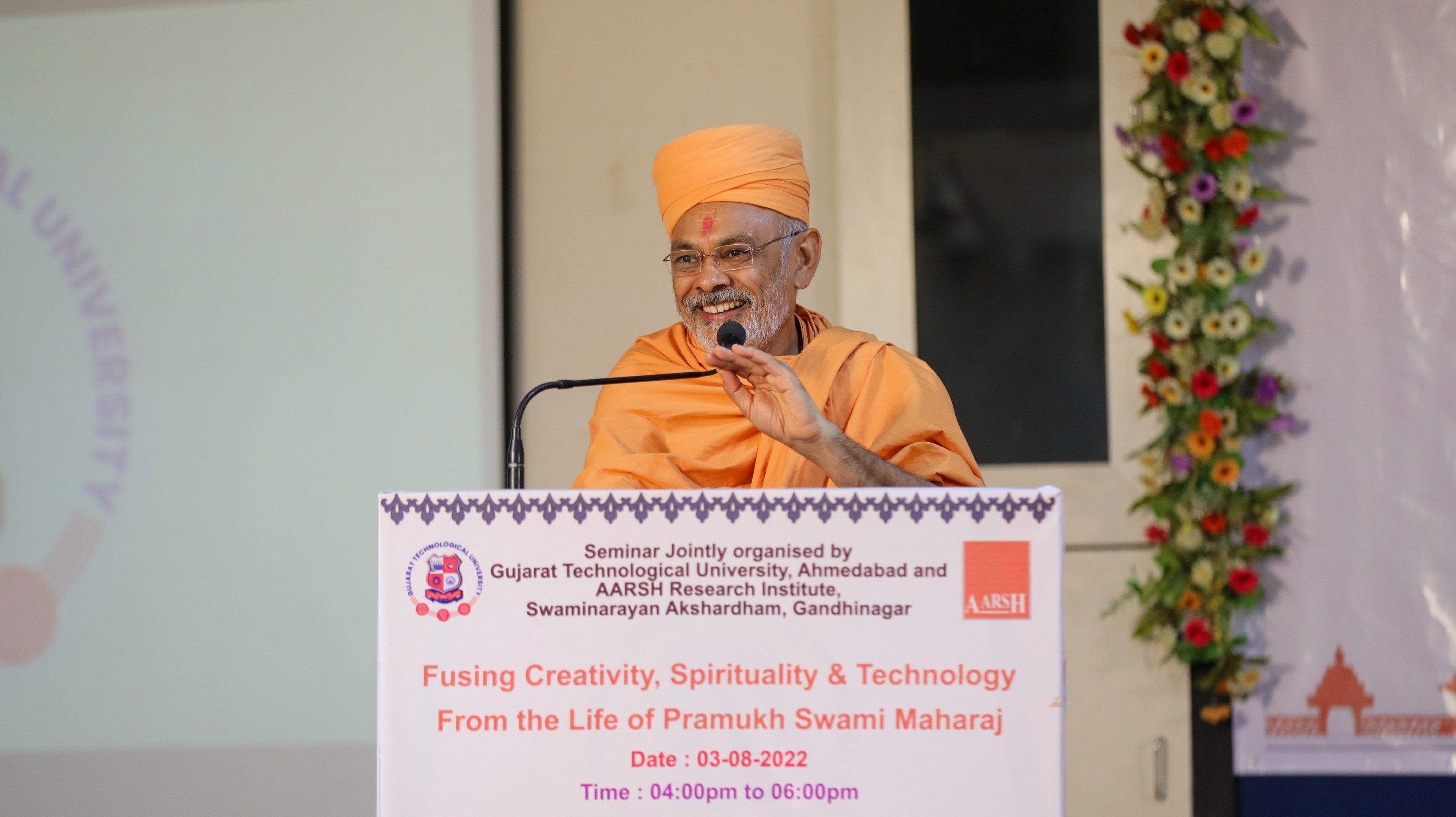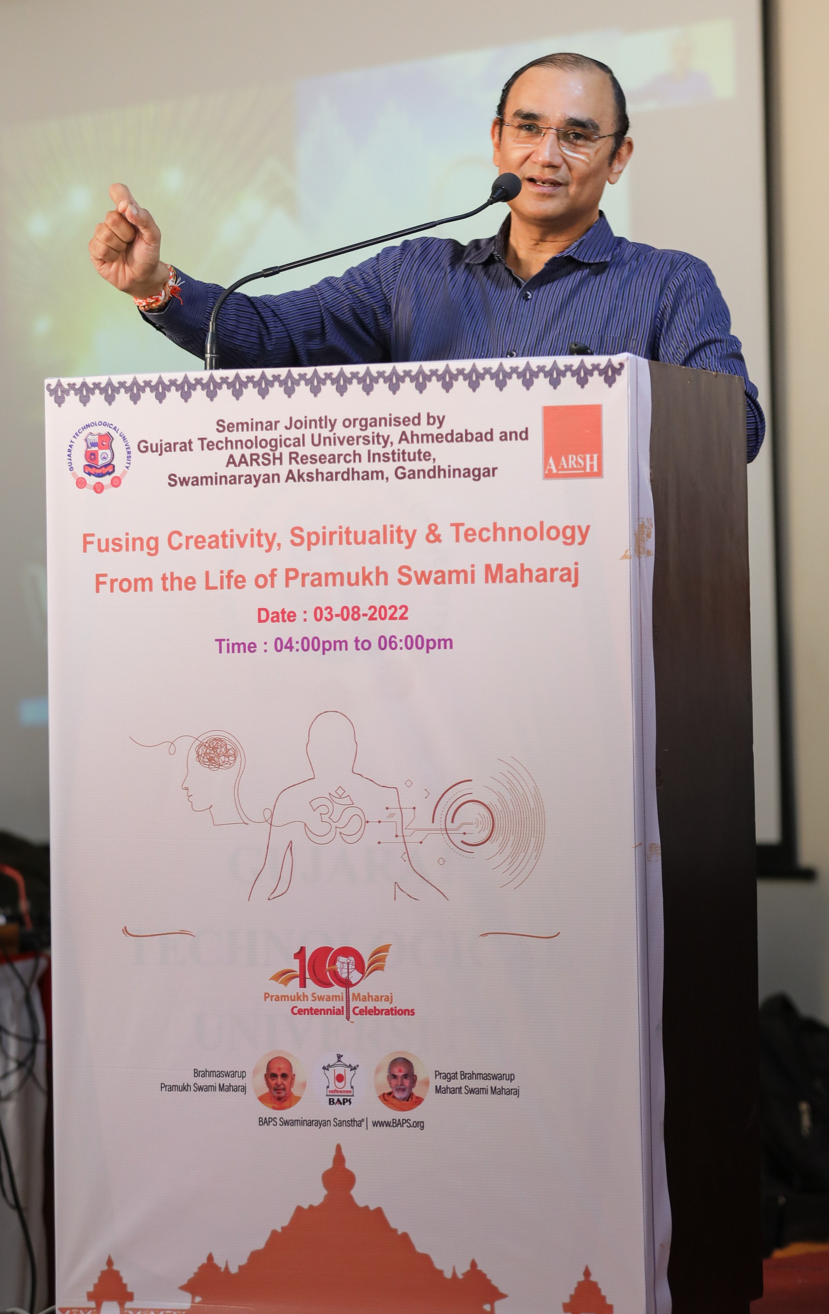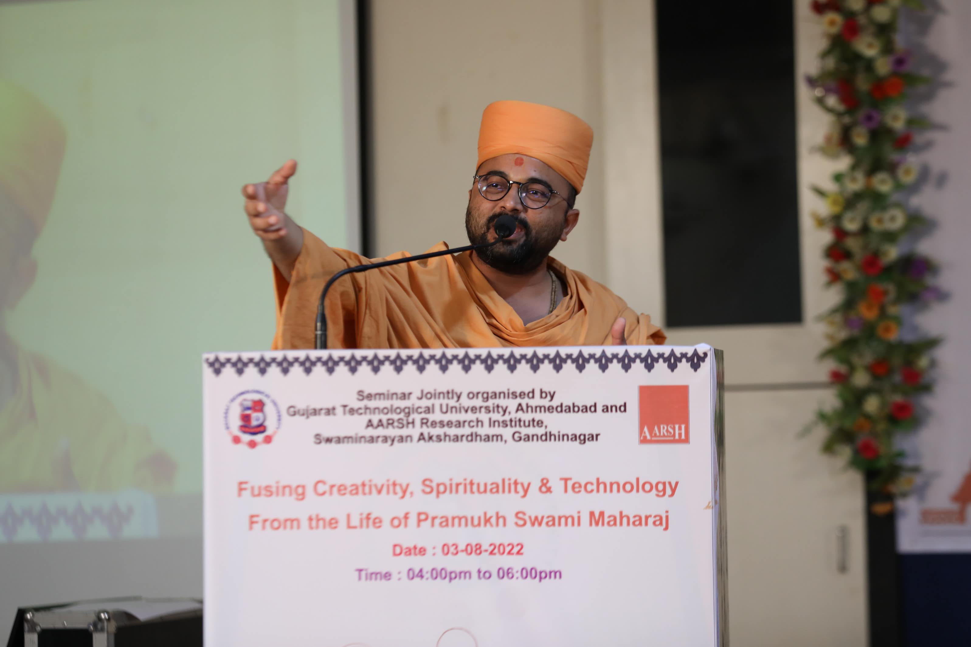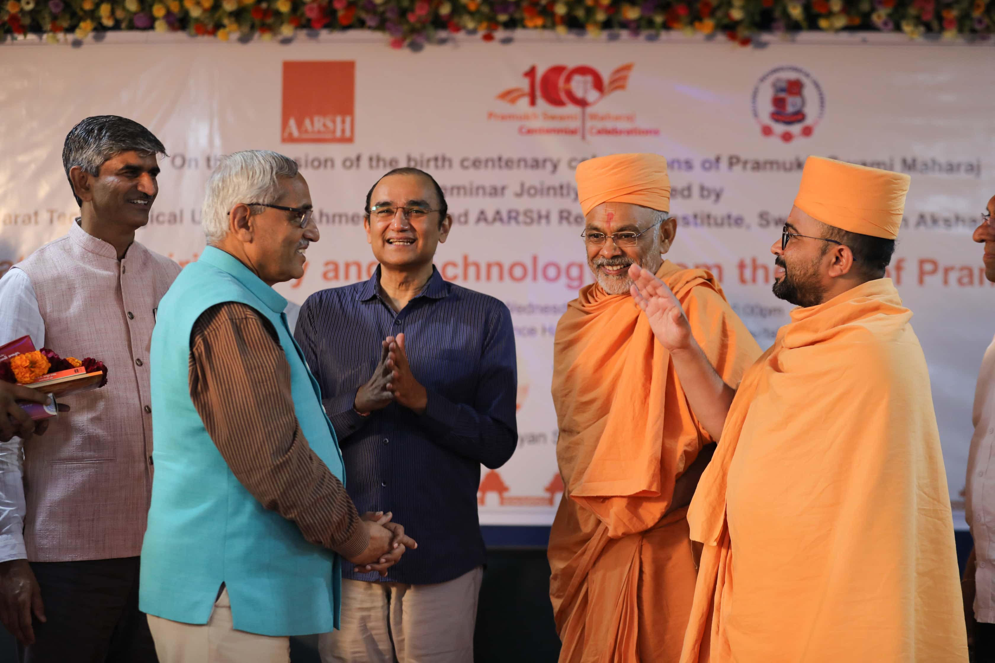 Under the auspices of the Brahmaswarup Pramukh Swami Maharaj Centenary Celebrations, Gujarat Technological University (GTU), Ahmedabad, in association with AARSH Research Institute, Swaminarayan Akshardham, Gandhinagar, organized a seminar on the topic ‘Fusing Creativity, Spirituality and Technology: From the life of Pramukh Swami Maharaj’ in the GTU conference hall.