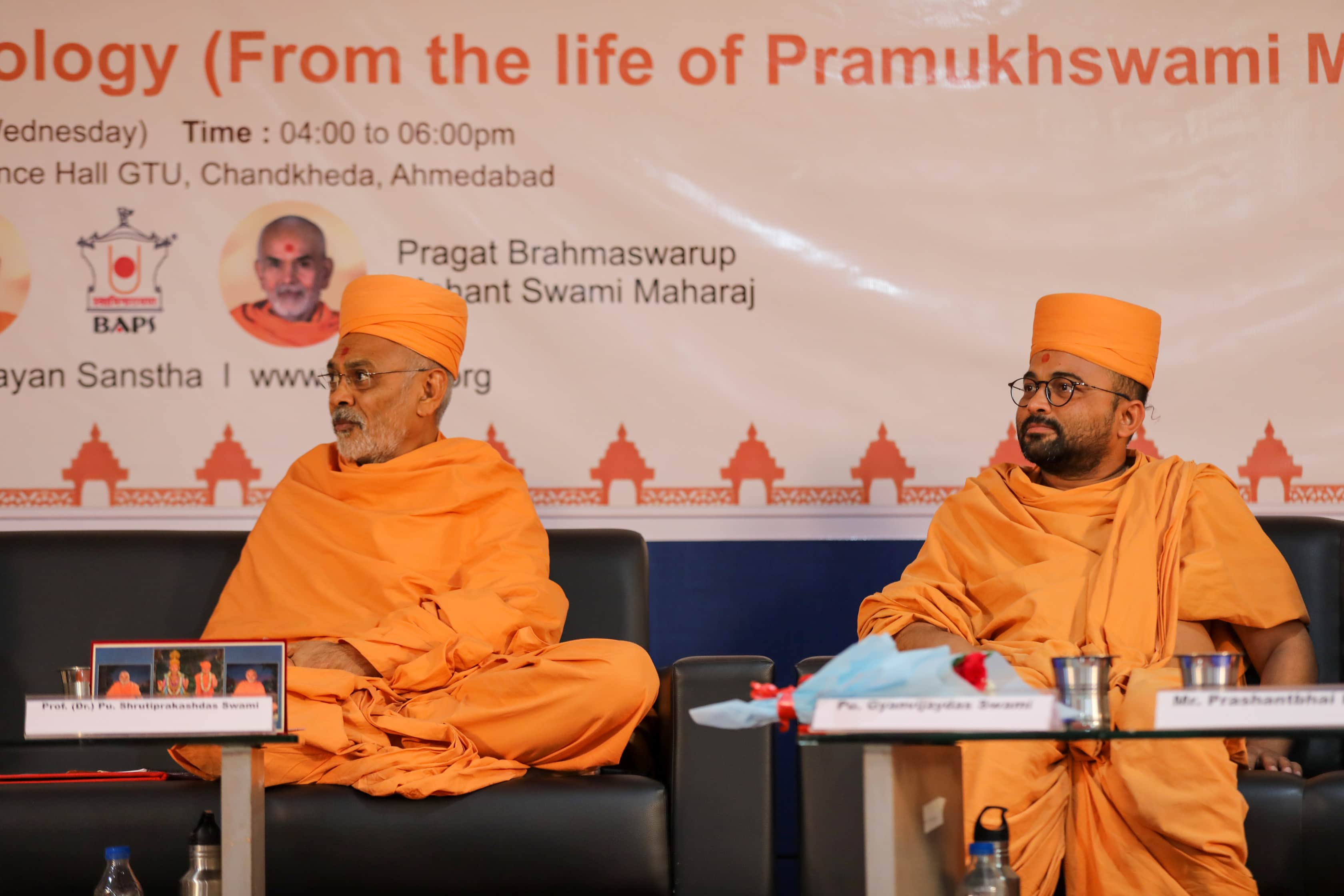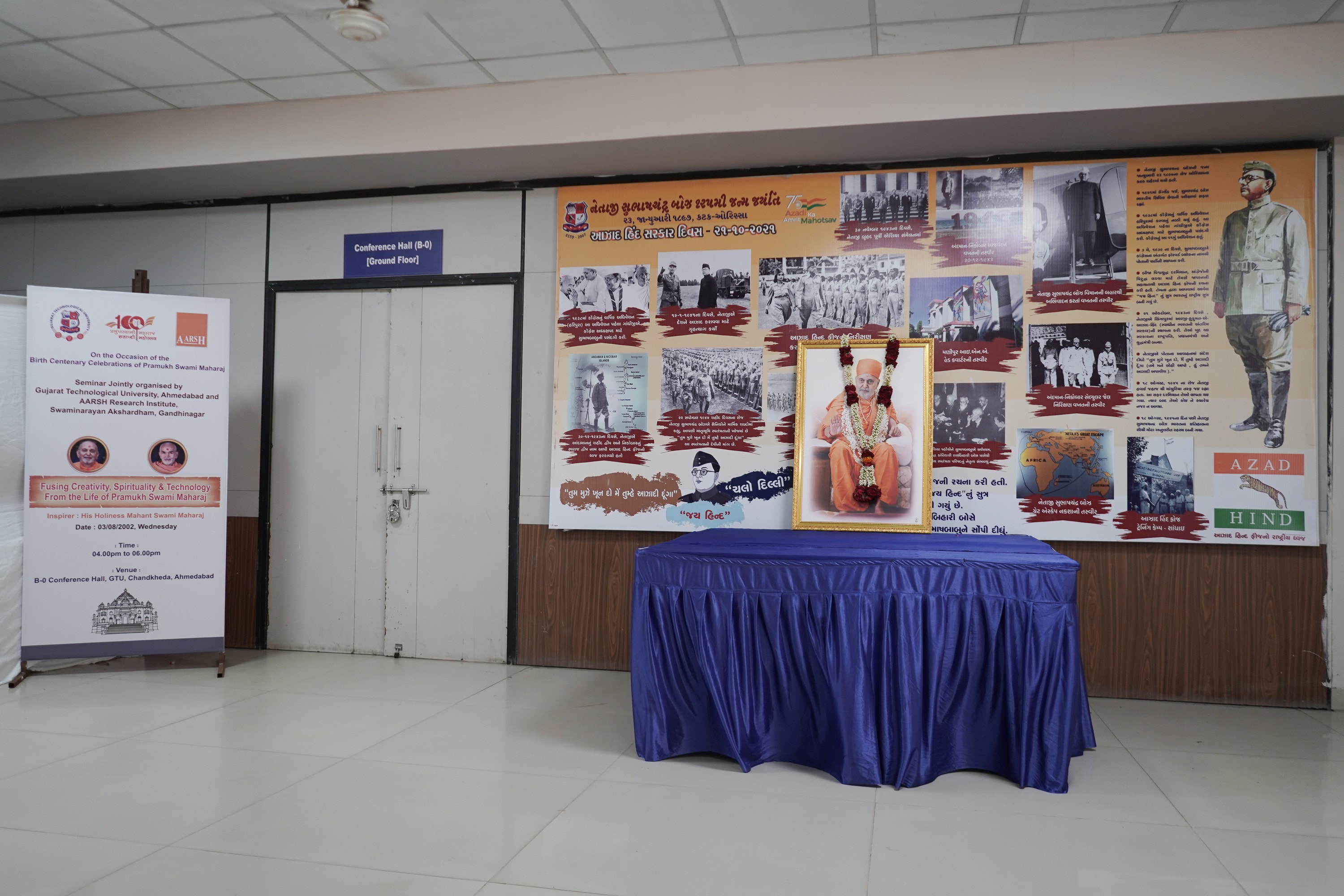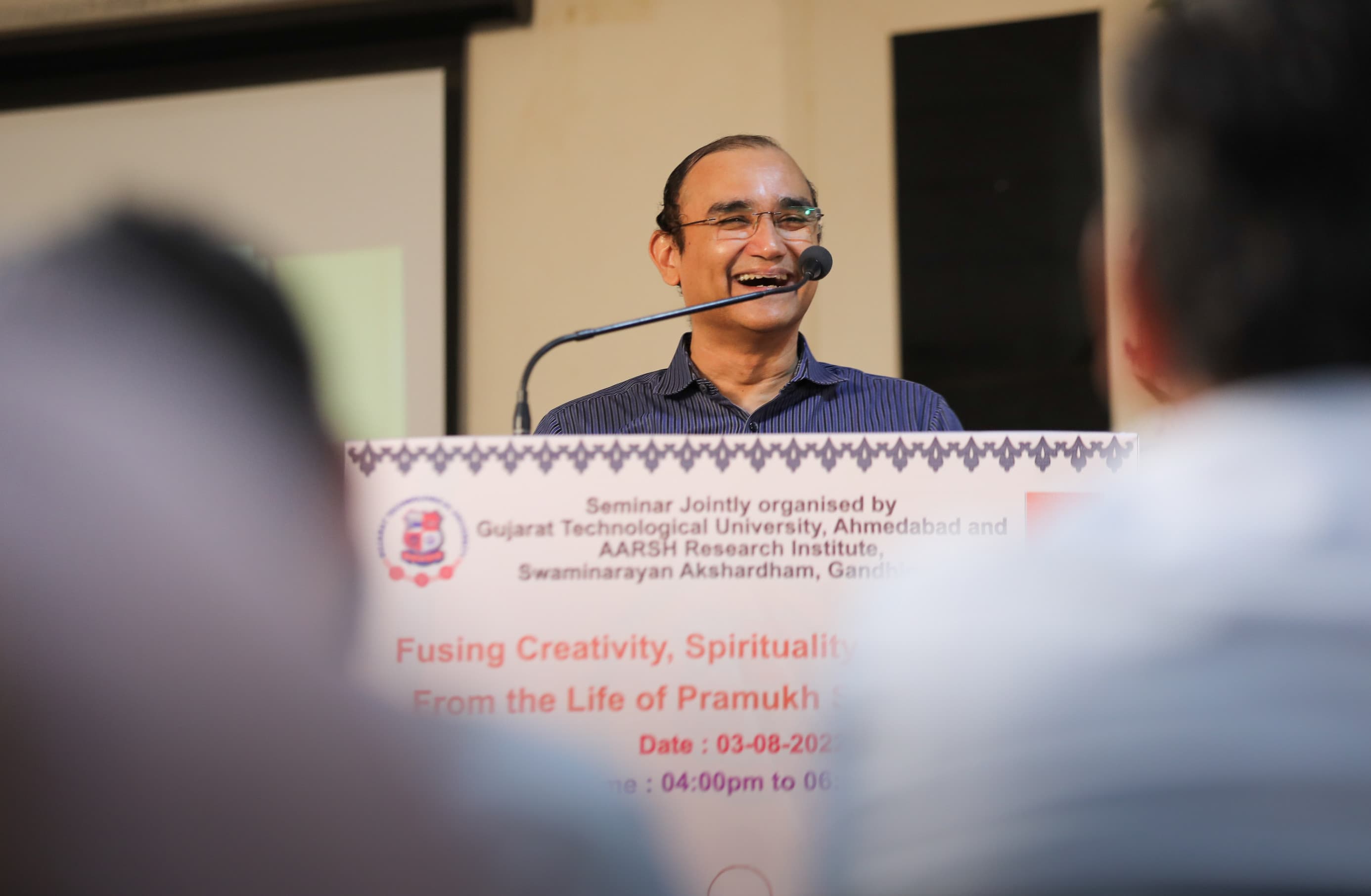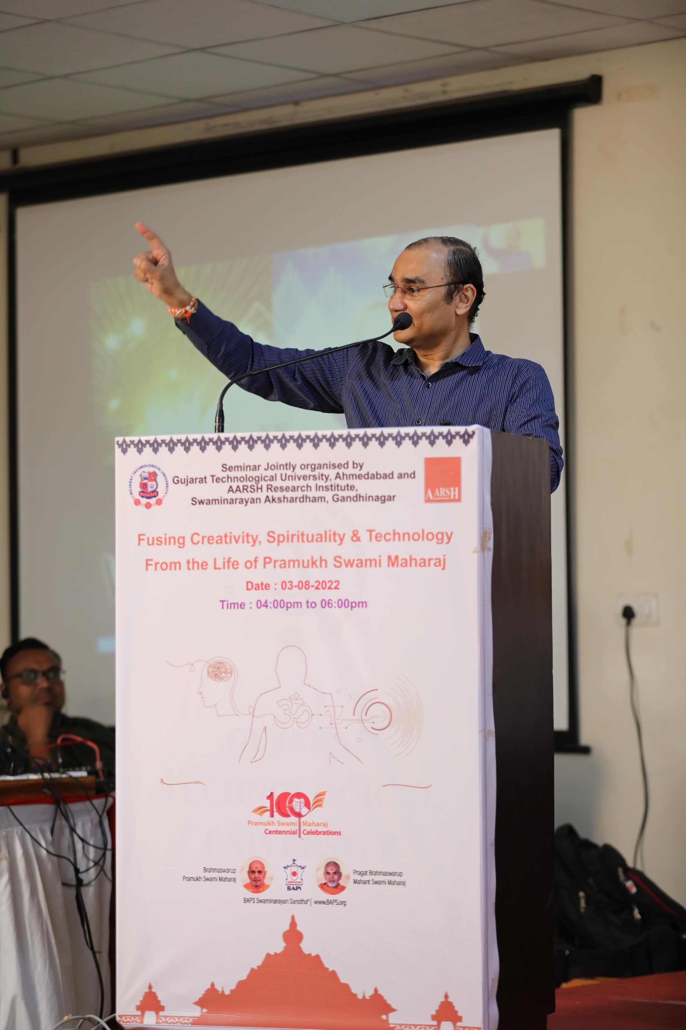 Under the auspices of the Brahmaswarup Pramukh Swami Maharaj Centenary Celebrations, Gujarat Technological University (GTU), Ahmedabad, in association with AARSH Research Institute, Swaminarayan Akshardham, Gandhinagar, organized a seminar on the topic ‘Fusing Creativity, Spirituality and Technology: From the life of Pramukh Swami Maharaj’ in the GTU conference hall.