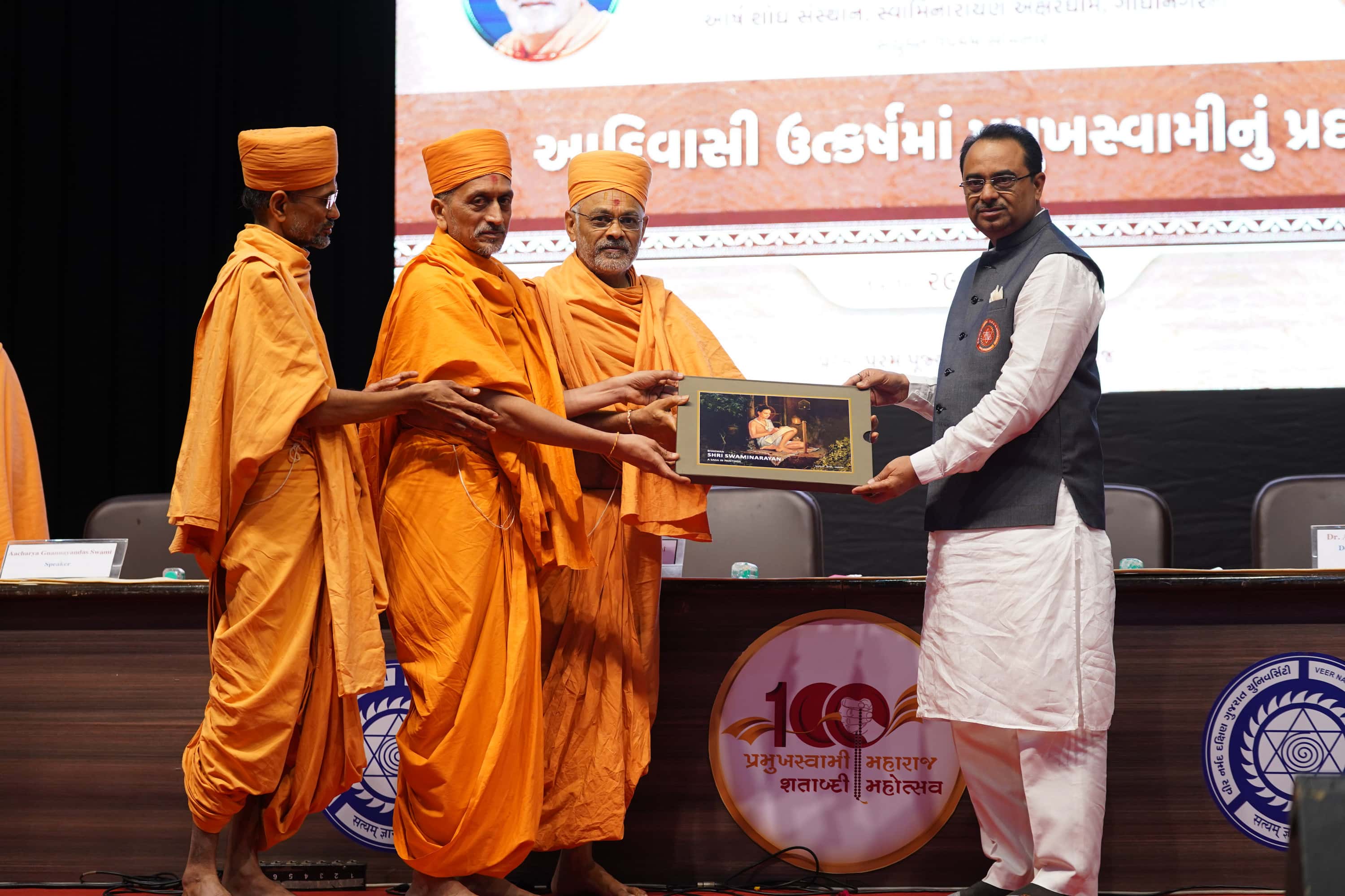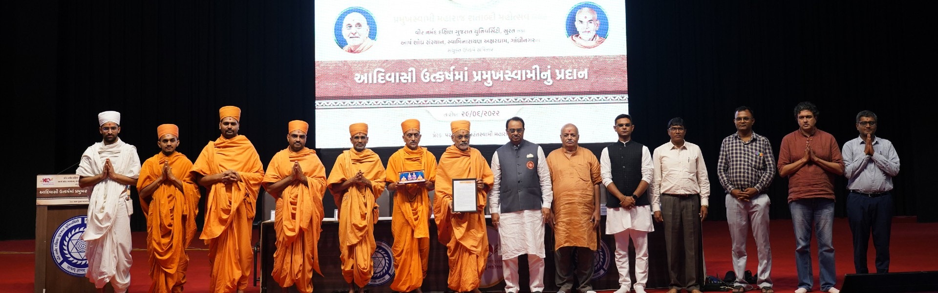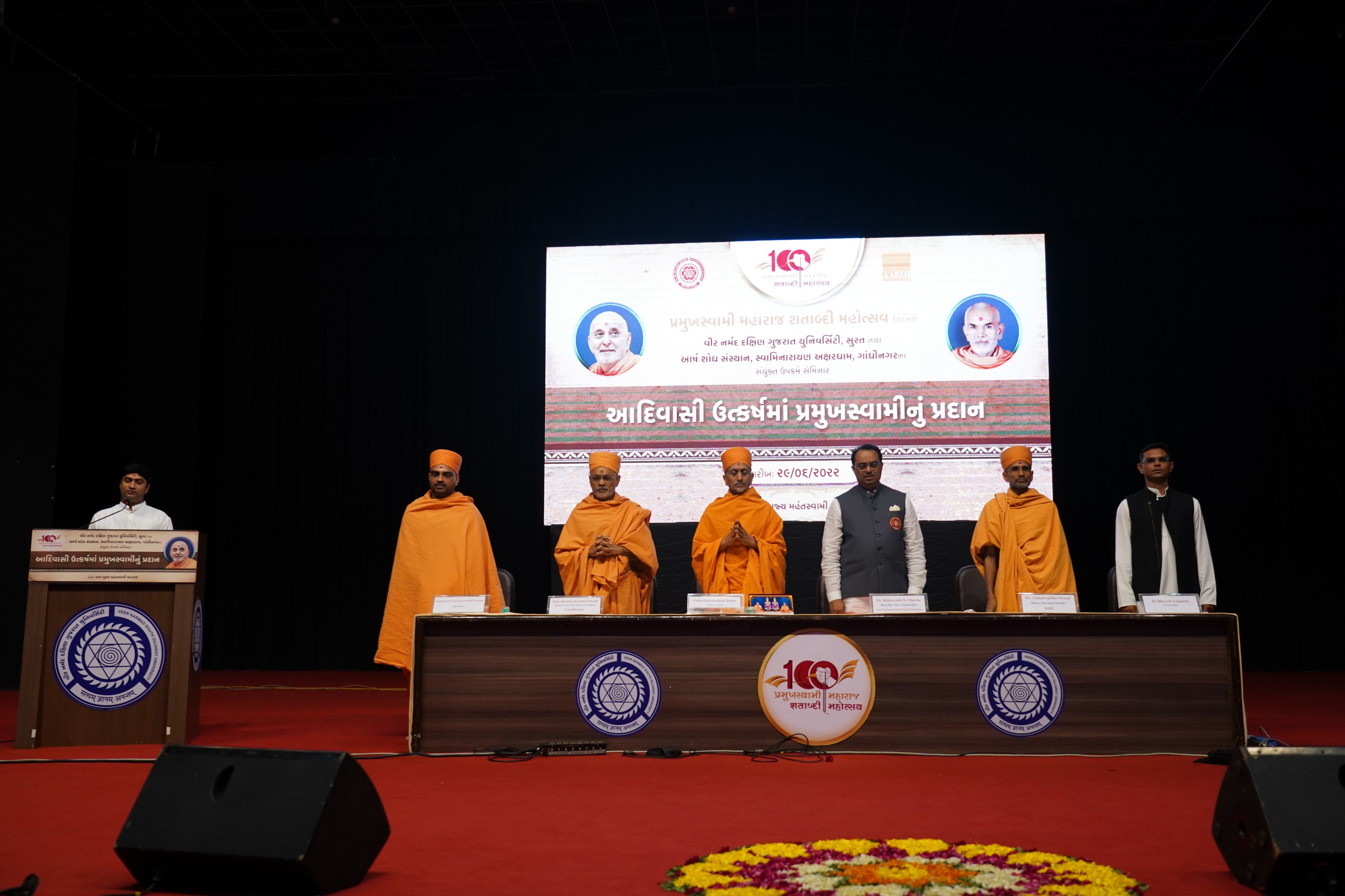 Under the auspices of the Brahmaswarup Pramukh Swami Maharaj Centenary Celebrations, Veer Narmad South Gujarat University, Surat in association with AARSH Research Institute, Swaminarayan Akshardham, Gandhinagar, organized a seminar on the topic ‘Pramukh Swami Maharaj’s Contribution in the Field of Tribal Upliftment’ at the Chanakya Hall.