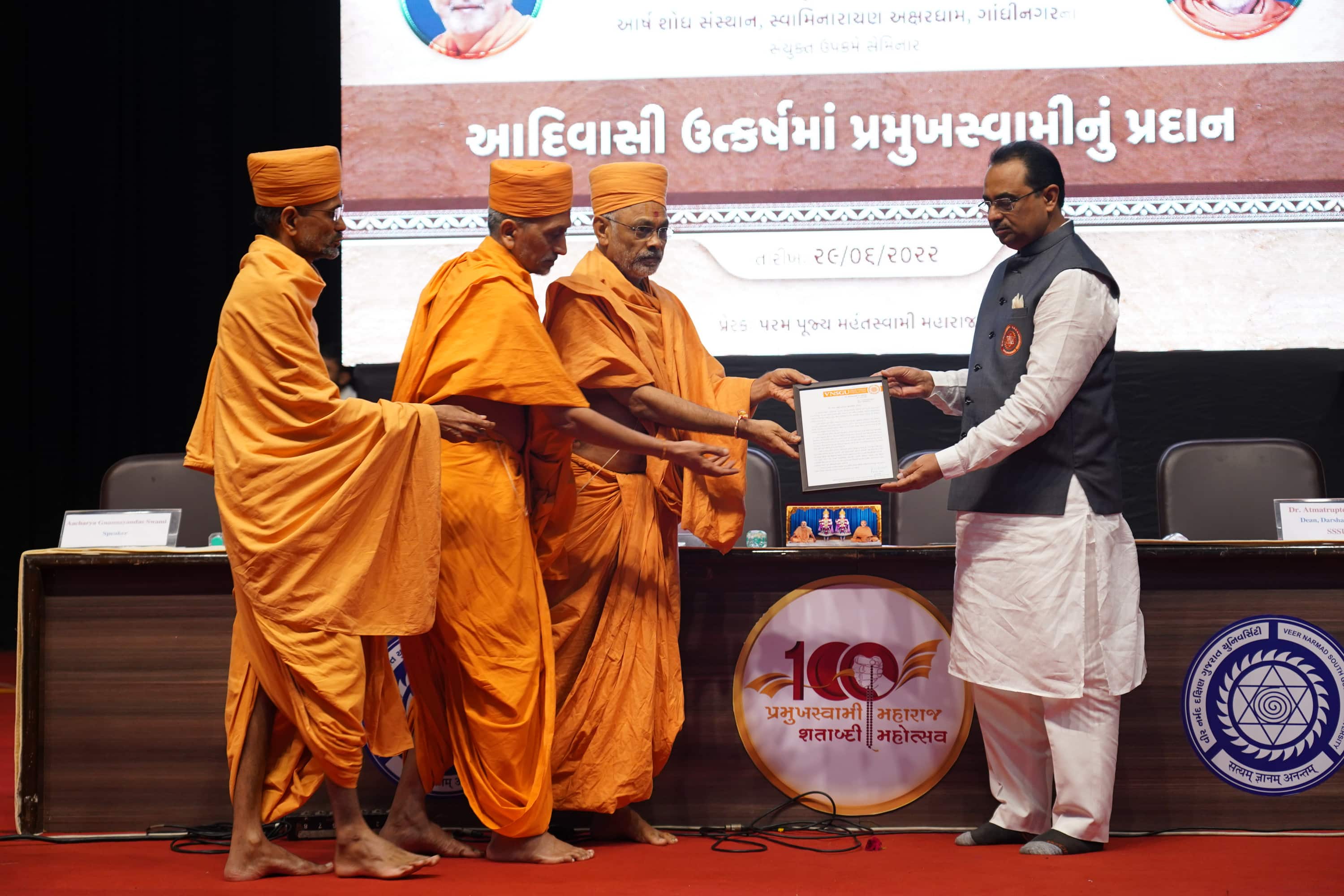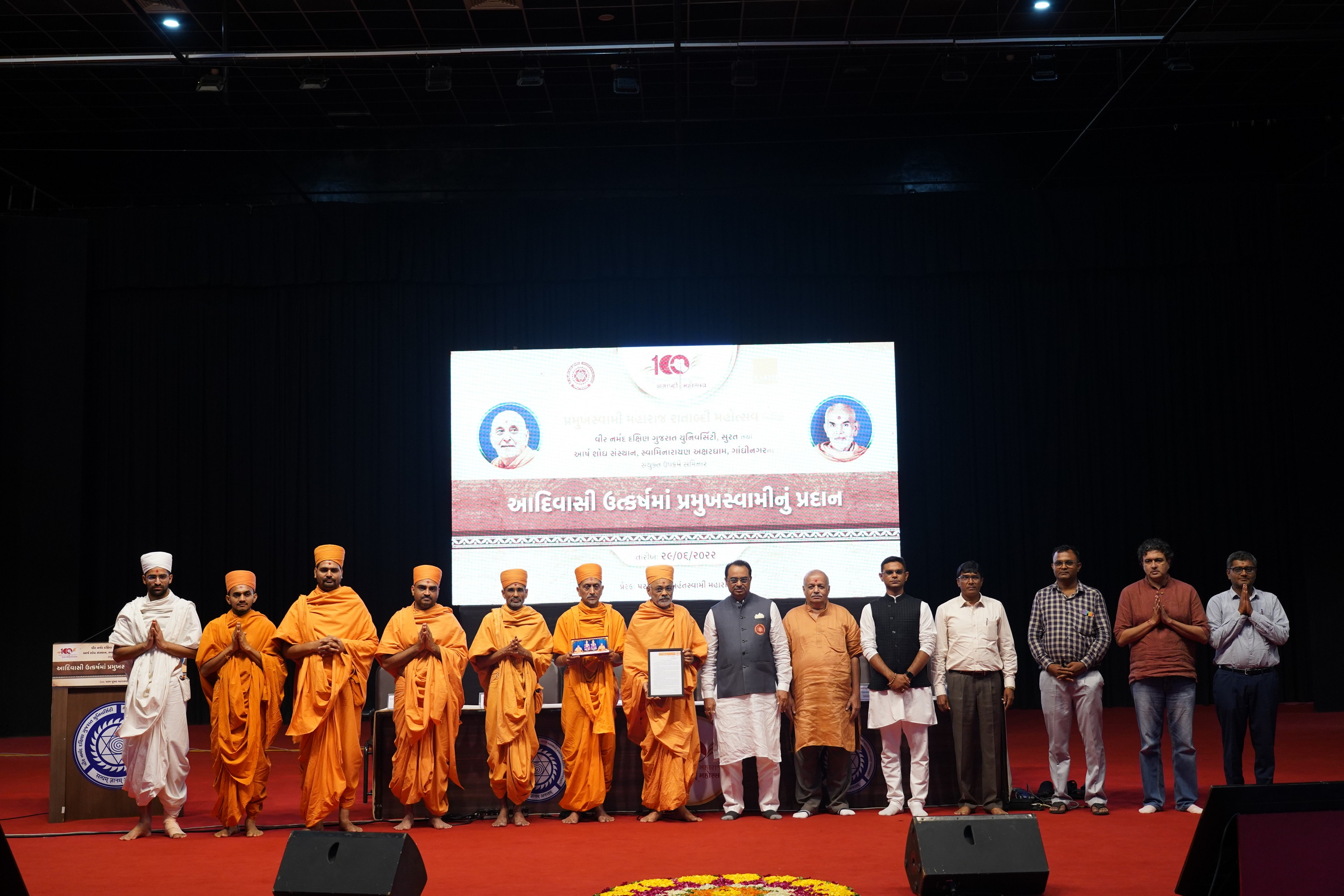 In his speech, Gnannayandas Swami of BAPS Swaminarayan Mandir, Sarangpur, highlighted that under the guidance of Pramukh Swami Maharaj, BAPS Swaminarayan Sanstha has addressed the needs of hundreds of remote and impoverished villages. Mindful of tribal cultures and practices, BAPS has worked to bring education and health care services to remote regions such as Ambaji and Dang. These underprivileged tribal communities have suffered from poverty, addictions, superstitions, crime and illiteracy. In 1977–78, Pramukh Swami Maharaj visited around 90 villages in a short span of 17 days in these areas. He toured the hinterlands of India and endured to inspire them to live an addiction-free life. His visits inspired many to undertake personal reform.
