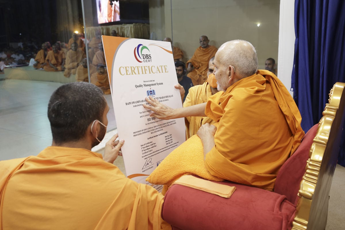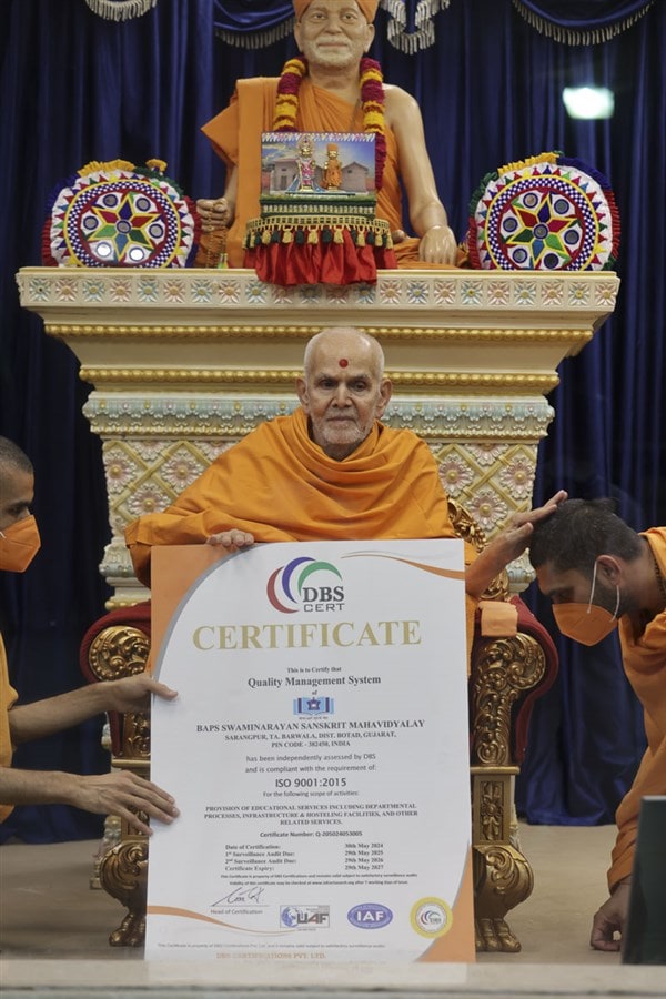 BAPS Swaminarayan Sanskrit Mahavidyalay in Sarangpur was established in 2013. On 4 June 2024, in the presence of His Holiness Mahant Swami Maharaj, the BAPS Swaminarayan Sanskrit Mahavidyalay was presented the International Organization for Standardization (ISO) 9001:2015 certificate by representatives of the IS0 – Mr. Ghanshyam Patel, Dr. Mehul Patel and Mr. Ajay Bhatt.