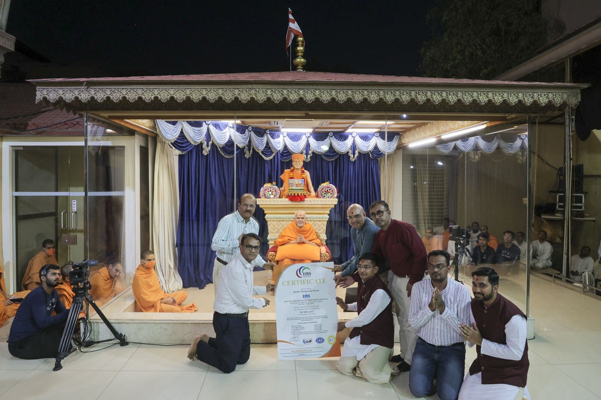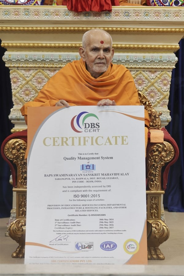 The IS0 is a globally recognized body that sets international benchmarks for quality standards. The ISO examines institutions in multiple ways, such as infrastructure and facilities, management, staff quality, working methods and other parameters. This certification acknowledges the quality, effectiveness and efficiency of the work of the assessed institution. BAPS Swaminarayan Sanskrit Mahavidyalay was thus evaluated against the prescribed international standards and deemed worthy of the ISO certification.