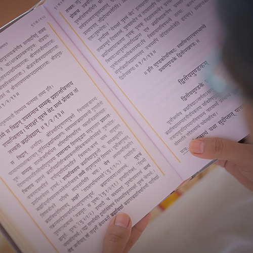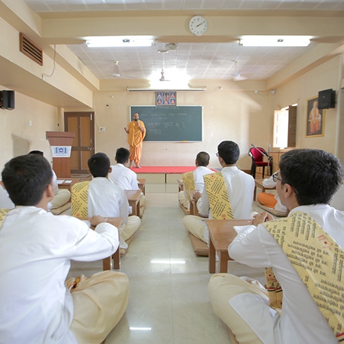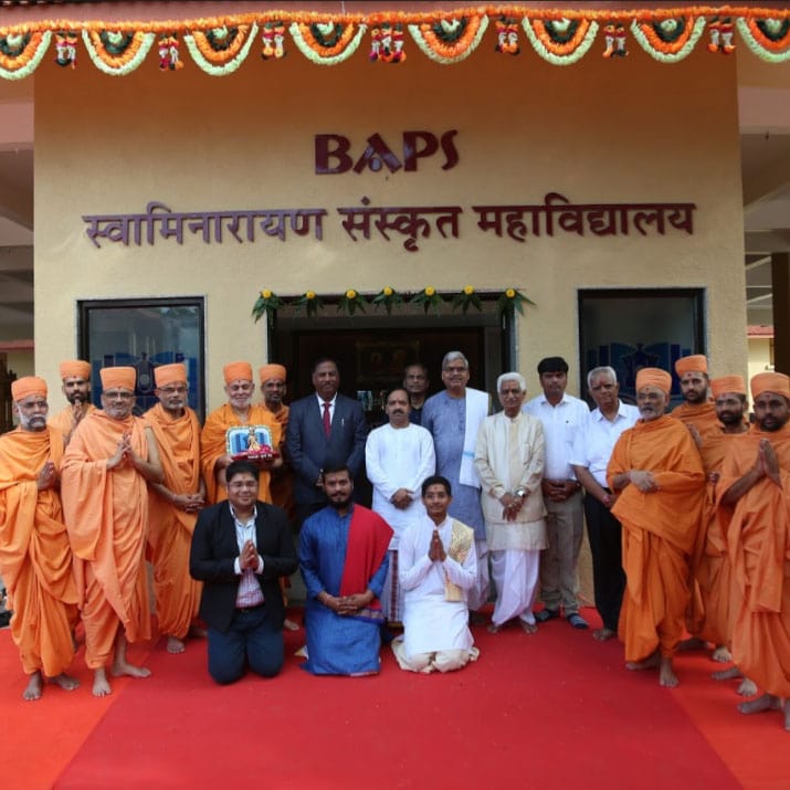 Soon after in 2014, the Mahavidyalay took its first steps by becoming instituted within a wing of the existing Yajñapuruṣa Sabhā Maṇḍapa, an auditorium located within the BAPS Swaminarayan Mandir, Sarangpur. Inaugurated by Pramukh Swami Maharaj, the Mahavidyalay initially became the home to a handful of students participating in Sanskrit language studies and advanced textual studies. The Mahavidyalay later began to accommodate the needs of students, instructors, and researchers from throughout Gujarat and supported a body of international students who wished to engage in a focused study of Sanskrit literature and sacred texts. As one of the Mahavidyalay’s researchers aptly revealed, “Even though many of us were not present during the early years, many of us feel connected to the Mahavidyalay as if we might have just as easily been there. Why is this? The Mahavidyalay, from its very inception, has been driven by a singular focus to offer sanctuary for serious, responsible, holistic education and research. Everything about the Institute that we recognize as distinctive flows from this foundational commitment.”